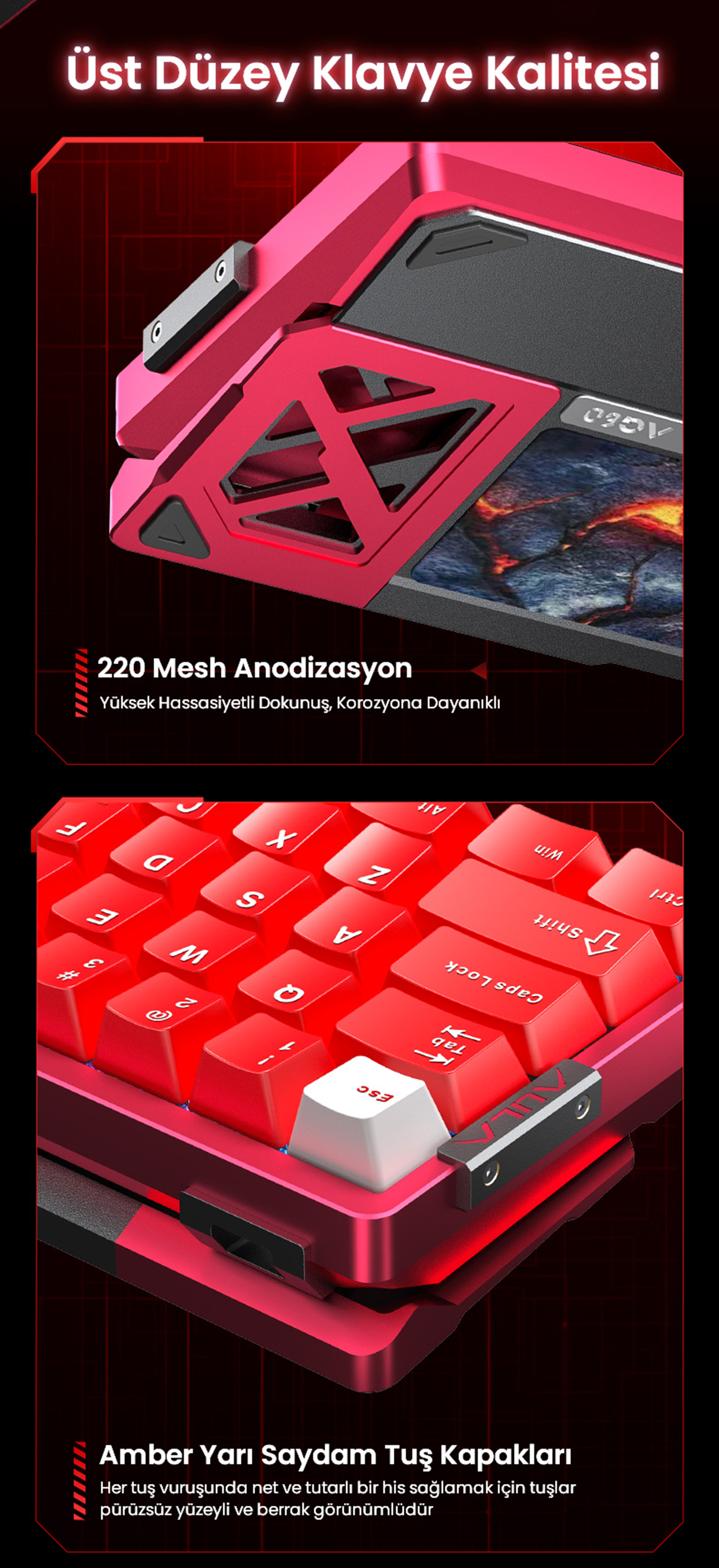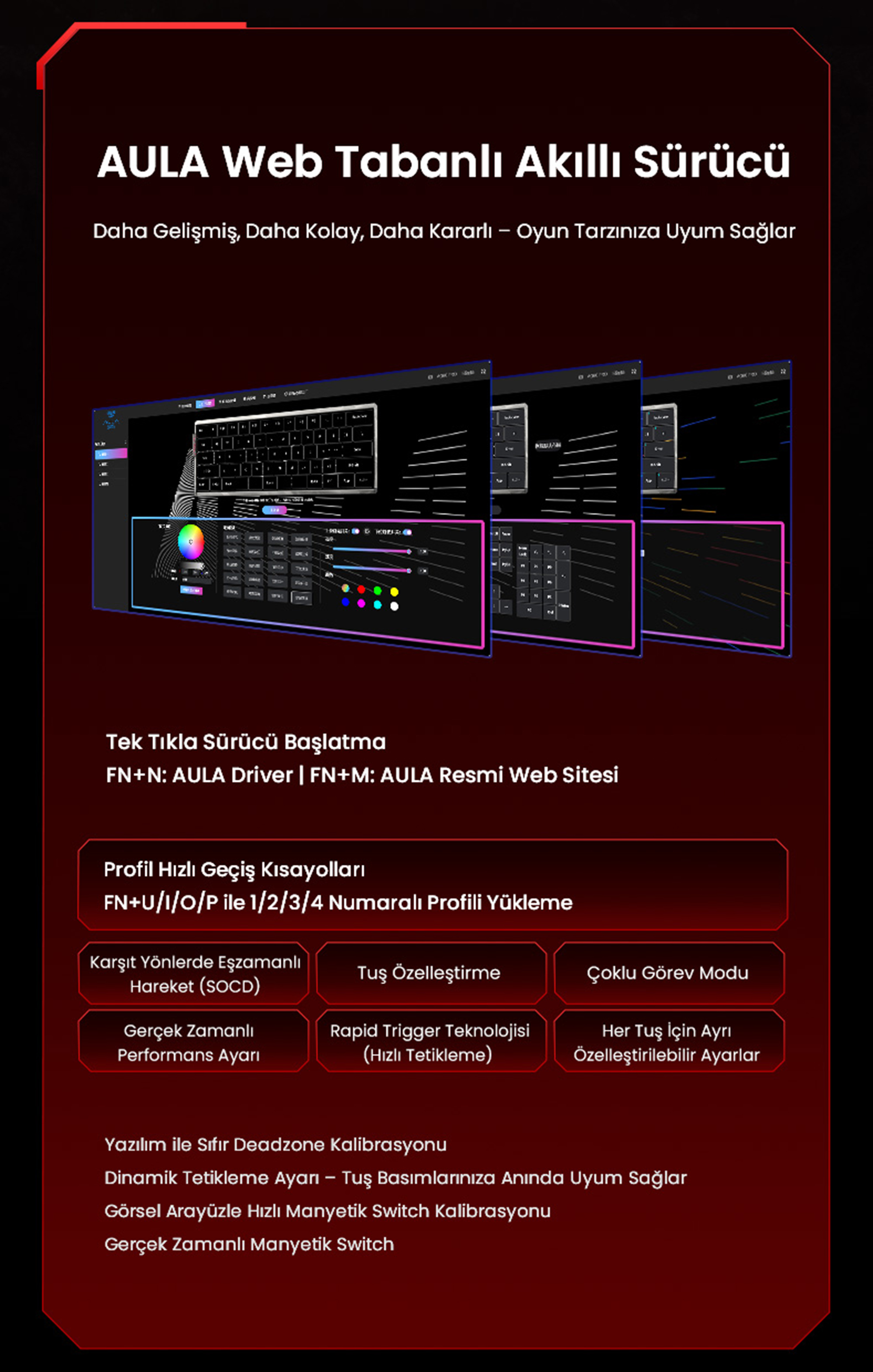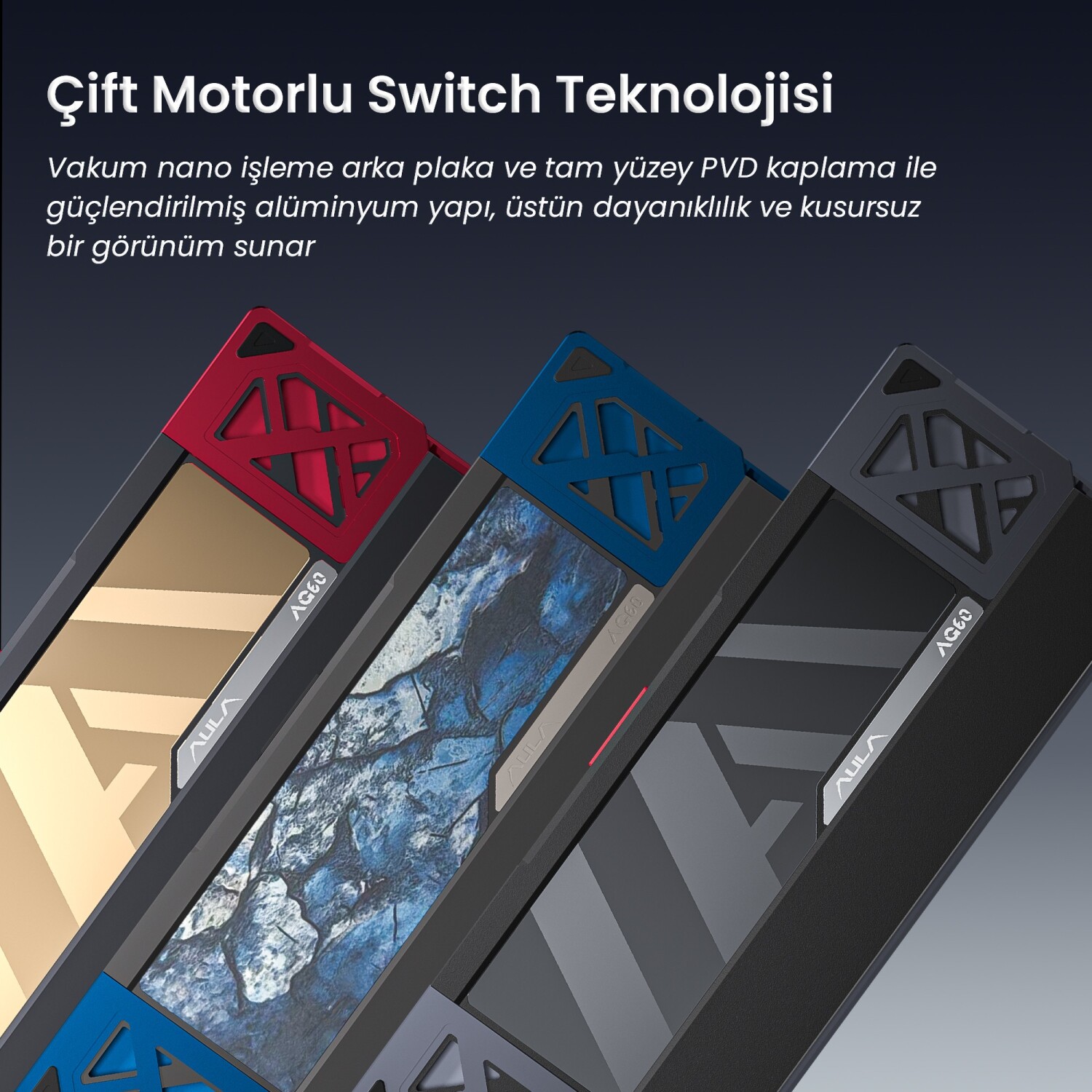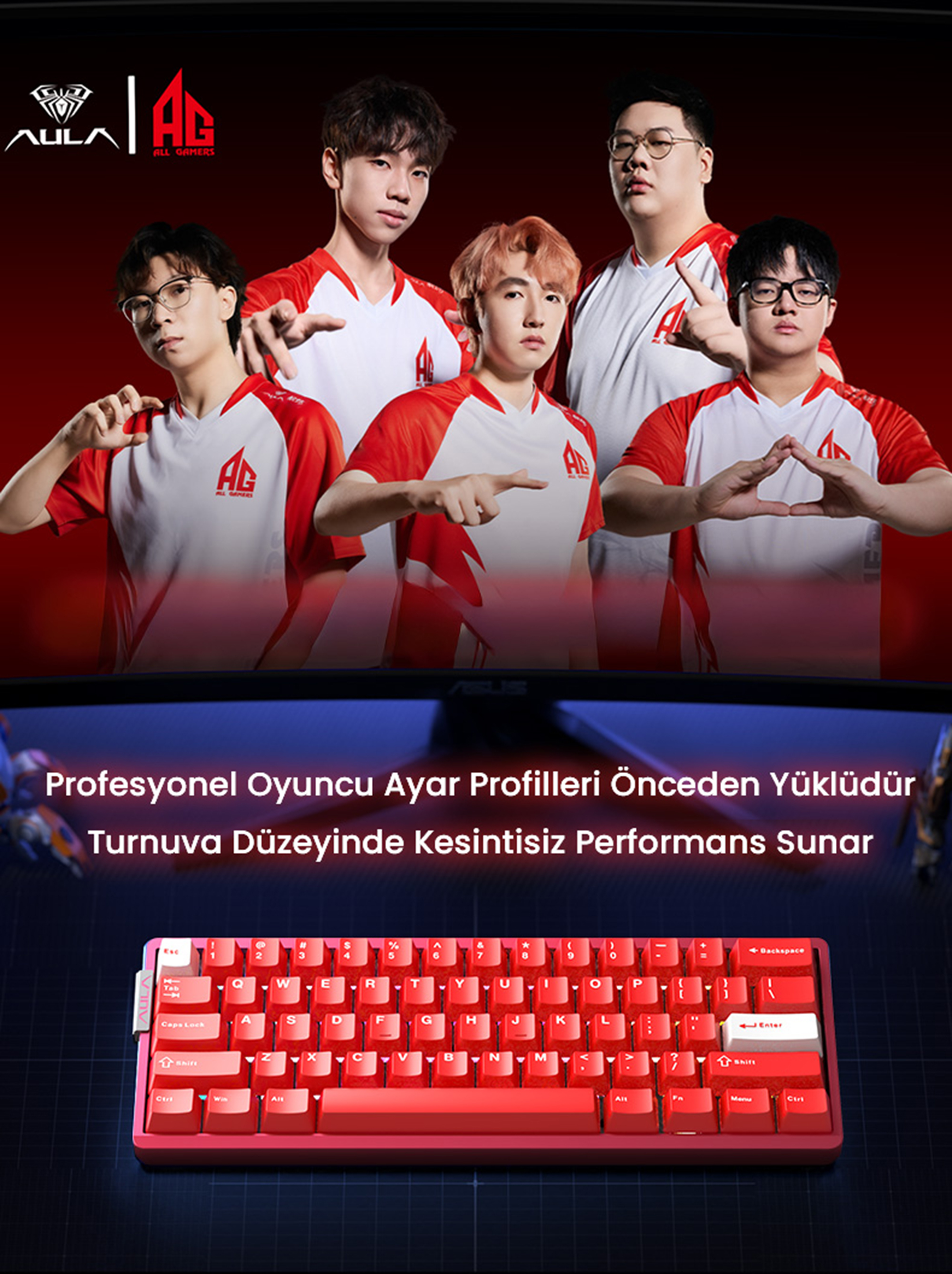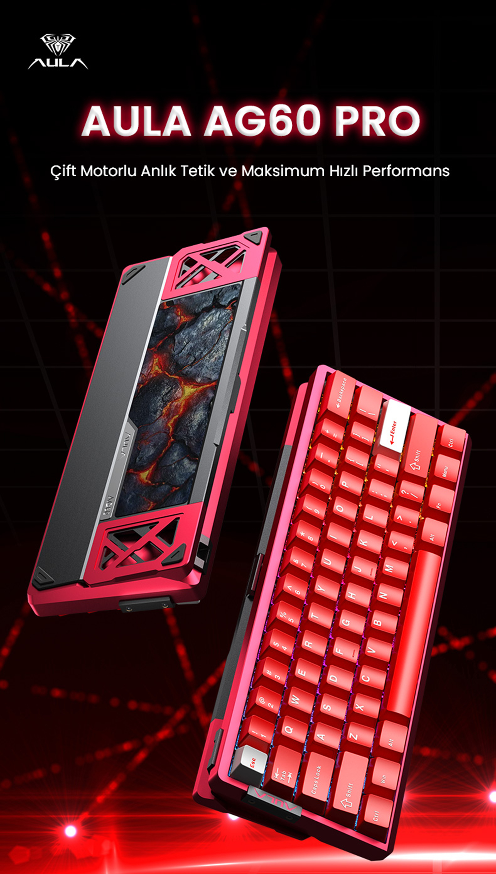 AULA AG60 PRO, rekabetçi oyunlarda sınırları zorlayan profesyoneller için geliştirilmiş %60 form faktöründe (61 Tuş) bir performans şaheseridir. Geleneksel mekanik switch'lerin ötesine geçen Manyetik Switch teknolojisi ile tuşların tetikleme mesafesini (actuation point) 0.001mm ile 3.3/3.4mm arasında tamamen kendi oyun tarzınıza göre ayarlayabilirsiniz. Devrim niteliğindeki Rapid Trigger (RT) özelliği sayesinde, parmağınızı tuştan tam çekmeden bile art arda muazzam hızlarda basım yapabilirsiniz. PRO versiyonuna özel olarak sunulan 8000Hz Polling Rate (Raporlama Hızı) ve 32.000Hz tam tuş tarama hızı sayesinde 0.1ms gibi ultra düşük bir gecikme süresi (latency) elde edilir. SOCD, Dinamik Tuş Vuruşu (DKS) ve Çok Noktalı Tetikleme (MPT) gibi haksız rekabet yaratacak düzeydeki donanımsal makro destekleriyle donatılmış olan bu model; 10 LED'li özel Space (Boşluk) tuşu, %100 Hot-Swap yapısı ve 16.8 milyon renkli RGB aydınlatmasıyla e-spor sahnesindeki en büyük avantajınız olacak.