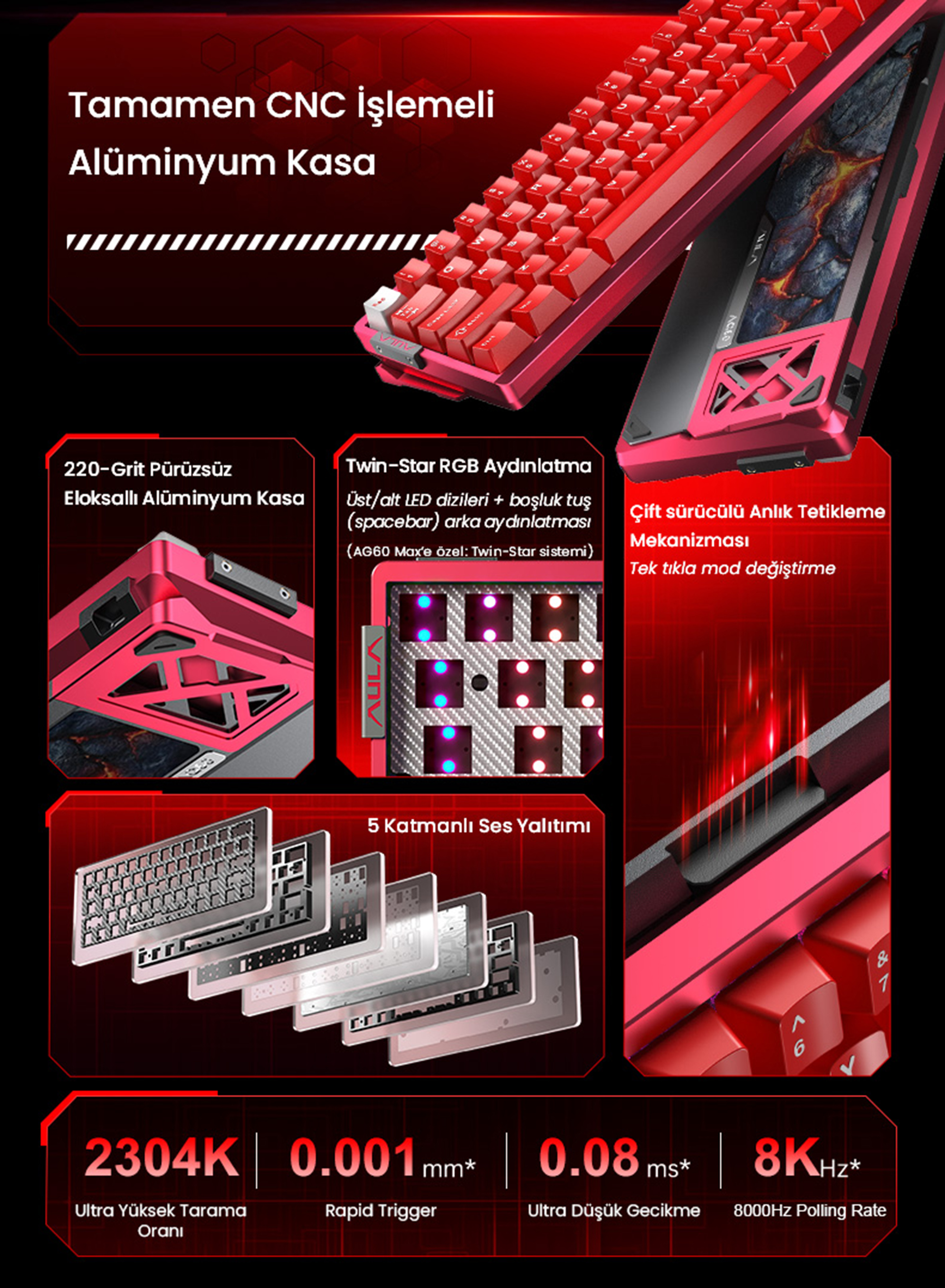 1 x Aula AG60 Pro Alüminyum Manyetik Klavye Hall Effect Aether Switch 8000Hz RGB TKL Hot Swap Oyuncu Klavyesi