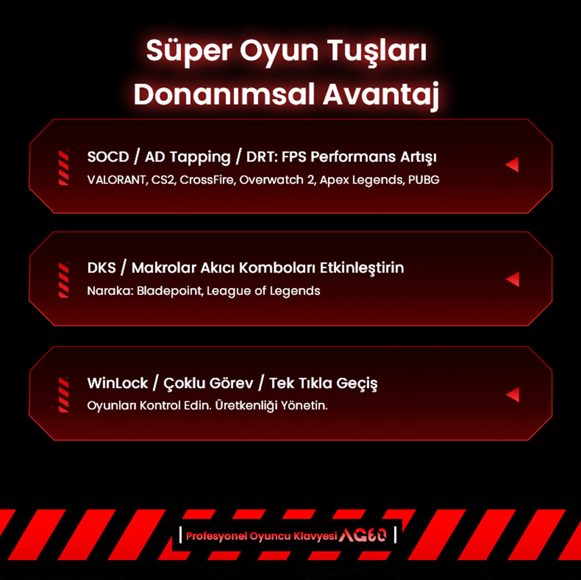 DKS (Dinamik Tuş Vuruşu): Tek bir tuşa, basma ve bırakma derinliğine göre 1 ile 4 arasında farklı görev atamanıza olanak tanır.
