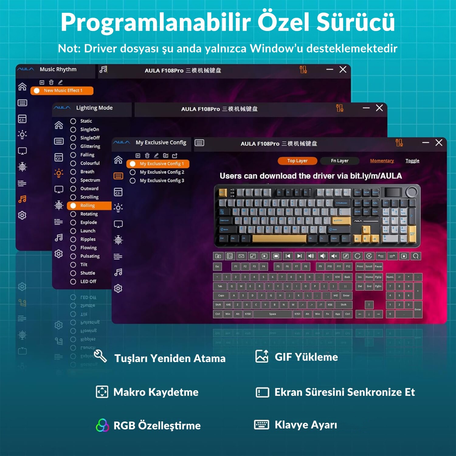 Aula F108 Pro tri mode bağlantı özelliği sayesinde Windows, Mac ve Android işletim sistemlerinde sorunsuz çalışır. Bluetooth 5.0, 2.4GHz kablosuz ve USB kablo bağlantı seçenekleri sunar.