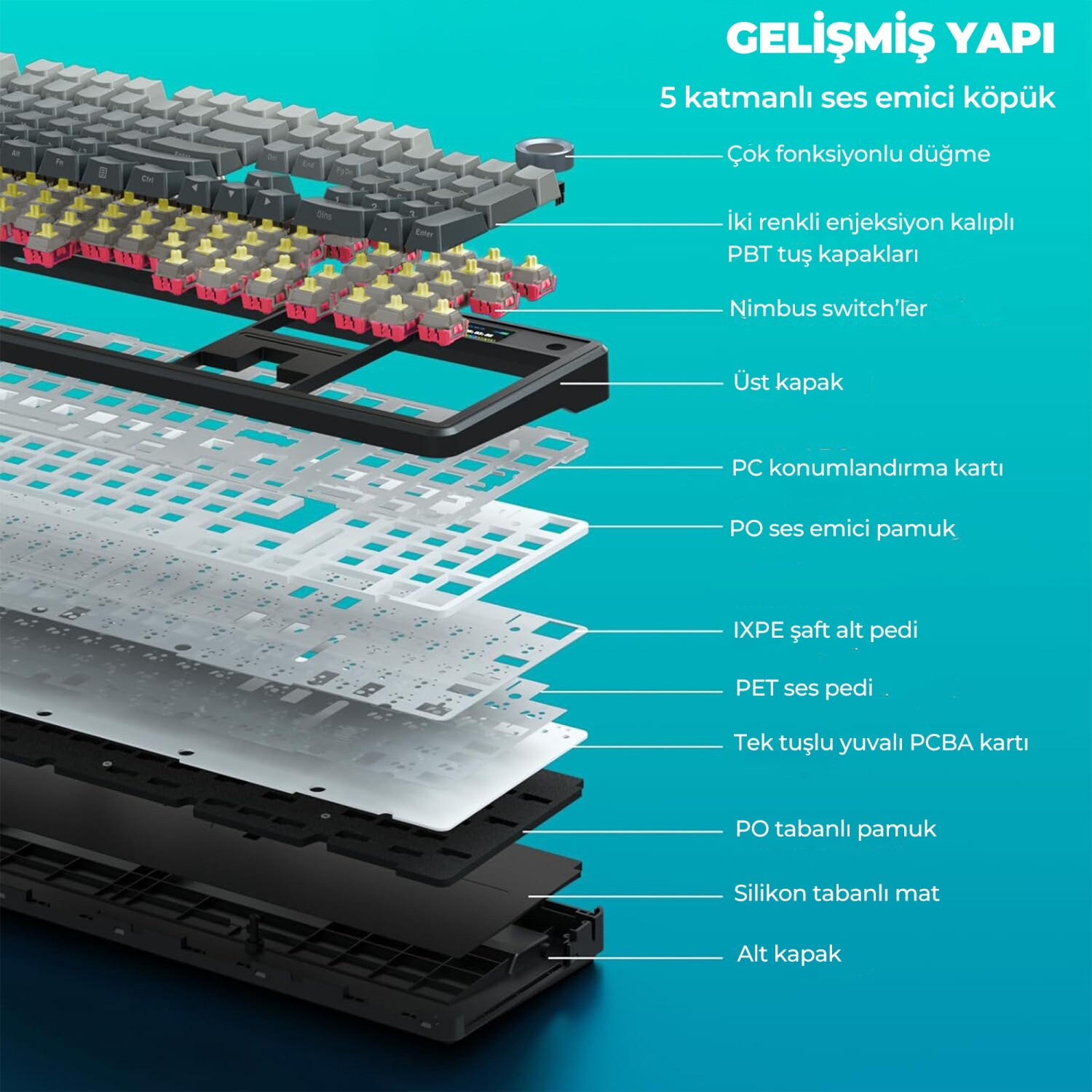 Beş katmanlı ses ve şok emici iç tasarım ile donatılan RGB mekanik klavye, masanızda tatmin edici ve sakin bir yazma deneyimi sunar. PO Sandwich Köpük, PET Ses Geliştirme Pedi ve diğer özel malzemeler sayesinde typing gürültüsünü minimize ederek hem ofis hem de ev ortamında ideal kullanım sağlar.