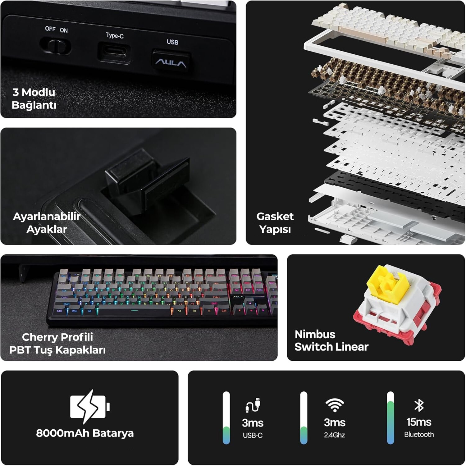 8000mAH batarya kapasitesi ile donatılan bu tri mode bağlantı özellikli klavye, ortalama gaming keyboards modellerinin iki katı güç sunuyor. Bluetooth, 2.4GHz kablosuz ve USB kablo modları ile PC, Mac ve Android cihazlarda sorunsuz çalışırken, 1000Hz klavye polling rate ile profesyonel seviyede performans garantiliyor.