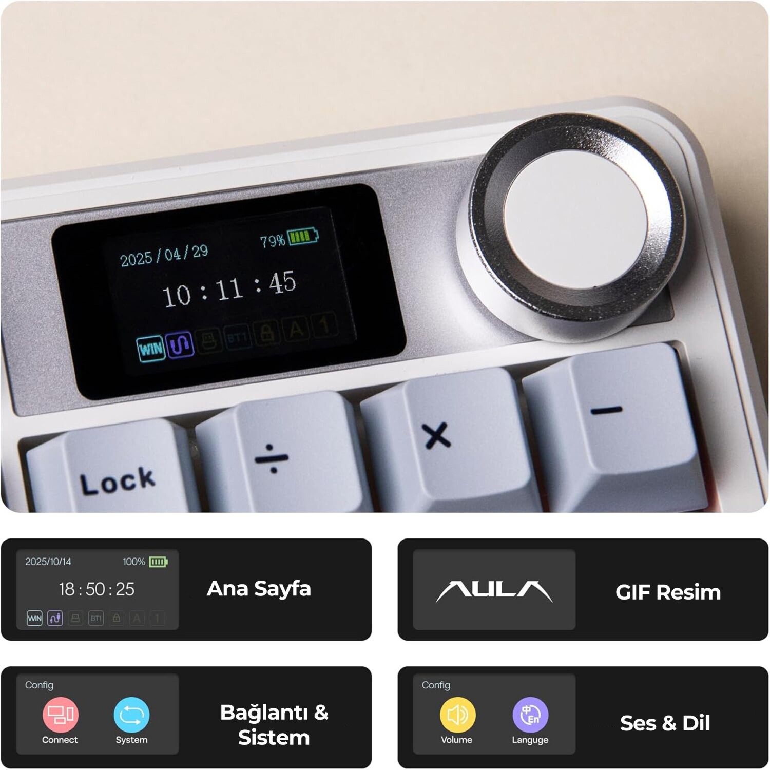Aula F108 Pro, ekranlı mekanik klavye kategorisinde öne çıkan full size mekanik klavye olarak oyuncu klavyesi dünyasında devrim yaratıyor. 8000mAH batarya kapasitesi ve 3 Modlu bağlantı özelliği ile donatılan bu RGB mekanik klavye, 1000Hz klavye performansı sunarak oyuncu klavyesi segmentinde yeni standartlar belirliyor.