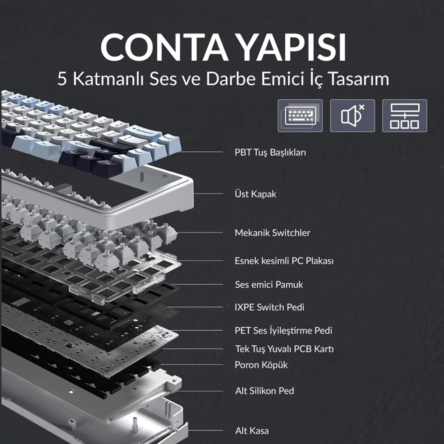 F65'in gasket mount yapısı, titreşimleri etkili şekilde sönümleyerek tuş vuruşlarından kaynaklanan gürültüyü minimize eder. Bu gaming klavye, iki katman Poron köpük, IXPE switch pad, PET ses geliştirici pad ve alt silikon pad olmak üzere beş katmanlı ses ve şok emici tasarımla donatılmıştır. Bu sofistike iç yapı, derin ve gürültüsüz bir ses profili oluşturarak zengin "thocky" yazma deneyimi sunar.