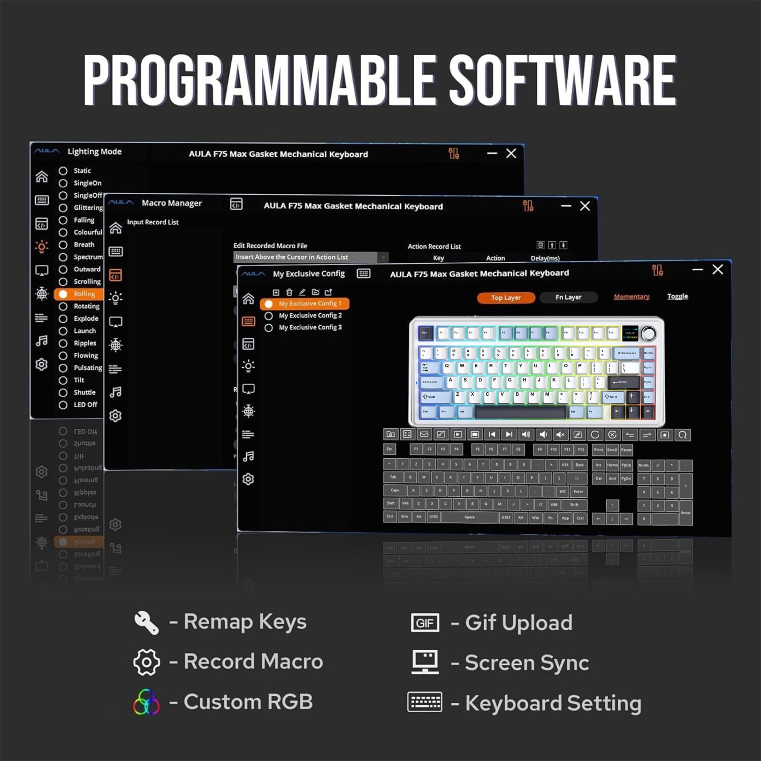 Aula F75 Max mekanik klavye, entegre TFT ekran teknolojisi ile kullanıcı deneyimini bir üst seviyeye taşır. Bu akıllı ekran, bağlantı durumu, pil seviyesi ve özelleştirilebilir GIF animasyonları gösterebilir. 1000Hz klavye performansı ile birleşen bu özellik, gaming klavye kullanıcılarına gerçek zamanlı bilgi sunar ve oyun deneyimini zenginleştirir.