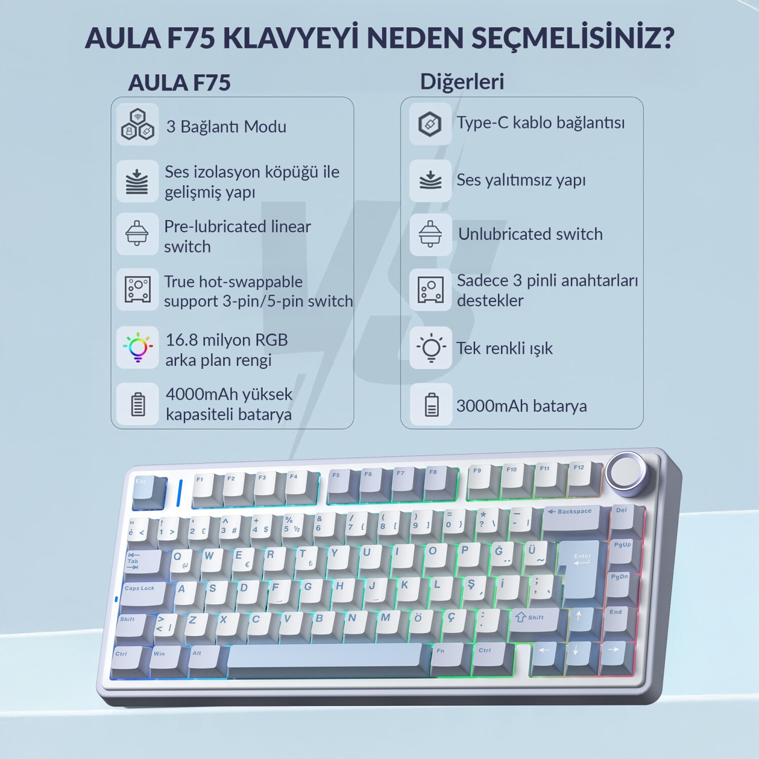 1 x Aula F75 Mekanik RGB TKL GrayWood V4 Switch Kablosuz Makrolu Hot Swap Türkçe Q Klavye Buz Mavi