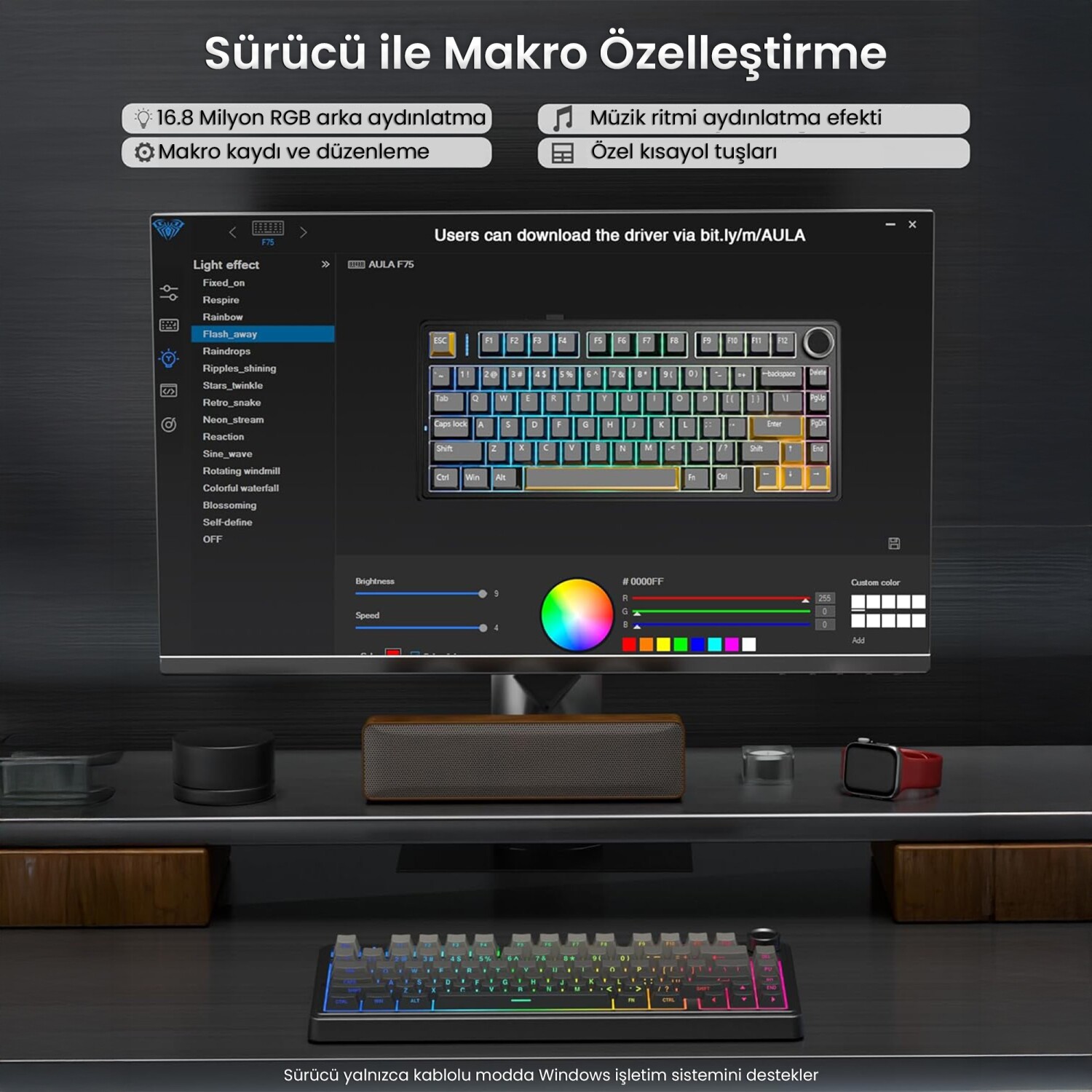 1 x Aula F75 Pro Mekanik RGB TKL Reaper Switch Kablosuz Makrolu Hot Swap Klavye Gradyan Gri