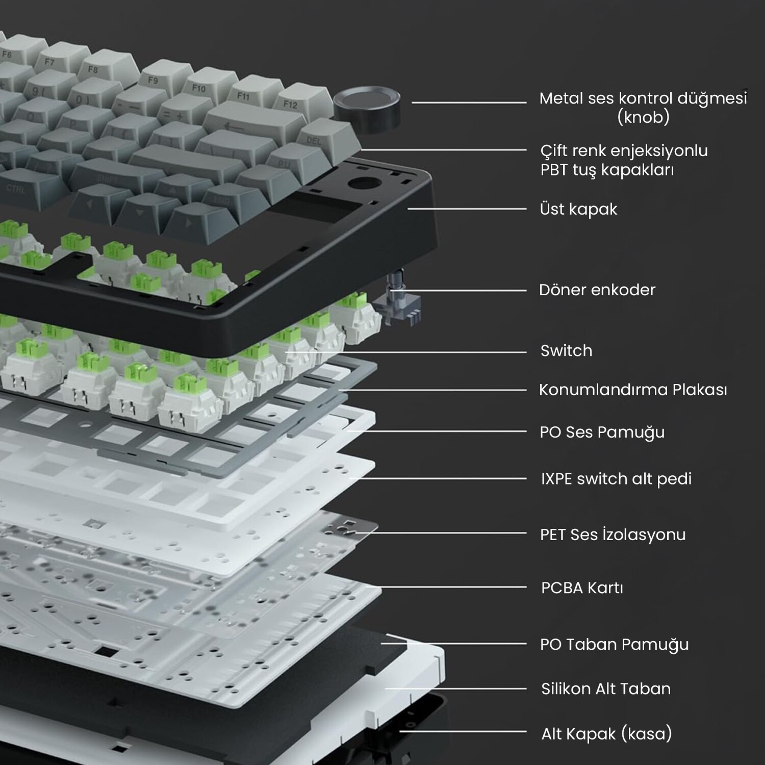 Bu mekanik klavye, dayanıklılığı artıran beş kat dolgu susturucusu, PCB ve konumlandırma plakası ile güçlendirilmiş bir yapıya sahiptir. Genişletilmiş entegre silikon ped ve PCB tuş yuvası, yazma deneyimini yumuşak ve esnek hale getirir. Şaft boşluğu ve konumlandırma plakası arasındaki boşlukları dolduran yapı, mekanik tuş sesini minimize eder ve sağlam bir his sağlar.