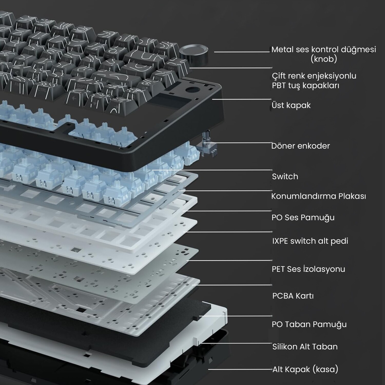Bu mekanik klavye, dayanıklılığı artıran beş kat dolgu susturucusu, PCB ve konumlandırma plakası ile güçlendirilmiş bir yapıya sahiptir. Genişletilmiş entegre silikon ped ve PCB tuş yuvası, yazma deneyimini yumuşak ve esnek hale getirir. Şaft boşluğu ve konumlandırma plakası arasındaki boşlukları dolduran yapı, mekanik tuş sesini minimize eder ve sağlam bir his sağlar.