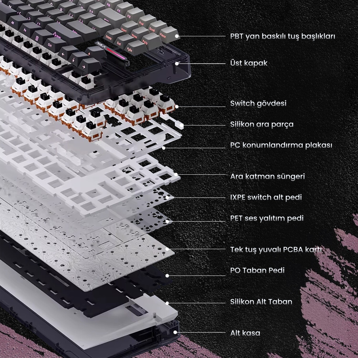Şık ve modern tasarımı ile dikkat çeken, 87 tuşlu mekanik klavyelerdir. Gasket yapısı ve yumuşak tuş hissi, uzun süreli kullanımlarda bile konfor sağlar. Tuşlar ve mekanik switchler değiştirilebilir yapıda olup, kullanıcılar kendi tercihlerine göre keycap ve switchlerle kişiselleştirme yapabilirler.