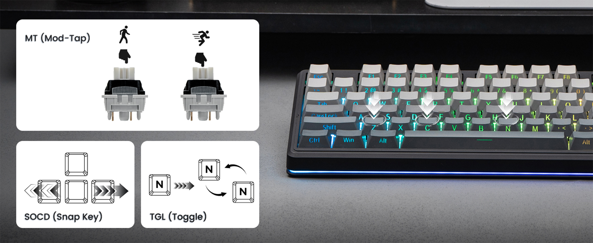MT (Mod-Tap): Bir tuşa hem basılı tutma hem de dokunma için farklı işlevler atar.