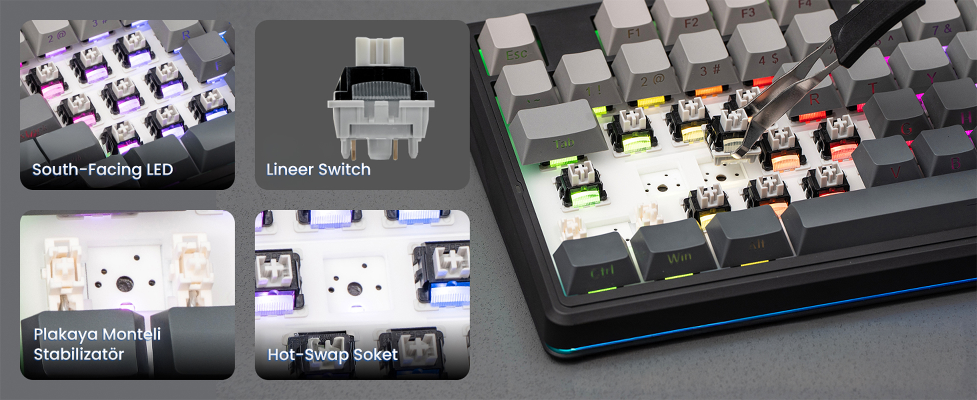 Hot-Swap PCB tasarımı sayesinde klavyede bulunan mekanik switchler lehim gerektirmeden kolayca değiştirilebilir. Bu özellik, kullanıcıların farklı switch türlerini deneyerek kendilerine en uygun yazım hissini oluşturmasına imkan tanır. Plate-Mount stabilizatörler özellikle büyük tuşlarda daha dengeli ve stabil bir kullanım sağlar. South-Facing LED tasarımı ise RGB aydınlatmanın tuş kapaklarıyla daha uyumlu şekilde yayılmasını sağlayarak görsel deneyimi iyileştirir.