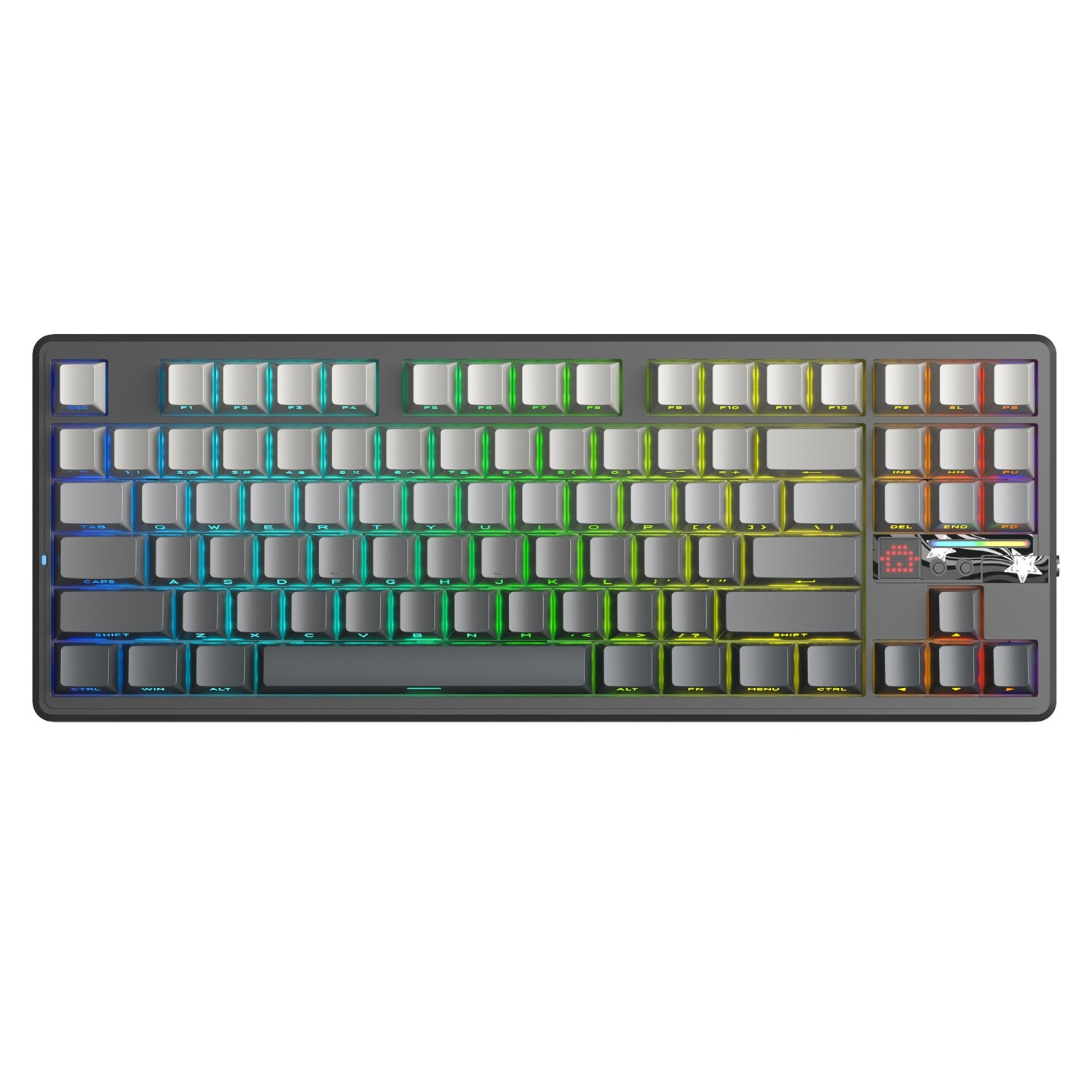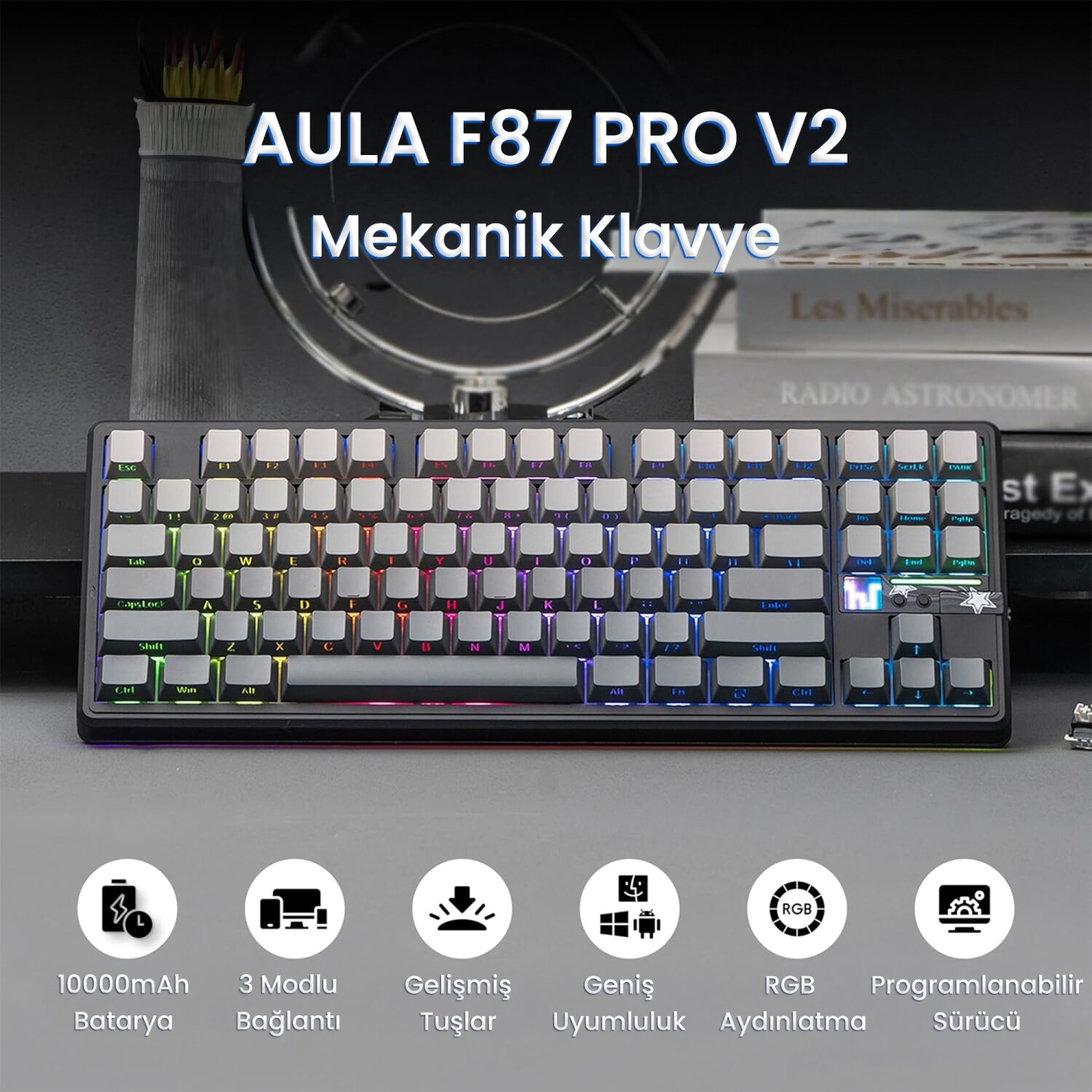 AULA F87 PRO V2, görsellik açısından da güçlü bir donanıma sahiptir. Tuş başına RGB aydınlatma sayesinde klavyenin ışık efektleri tamamen kişiselleştirilebilir. Klavyenin yan kısmında yer alan LED şeritler masaüstü kurulumuna modern bir görünüm kazandırır. Bunun yanında klavyede bulunan dot-matrix ekran sayesinde kullanıcılar çeşitli görsel göstergeleri ve özelleştirilmiş bilgileri görüntüleyebilir.