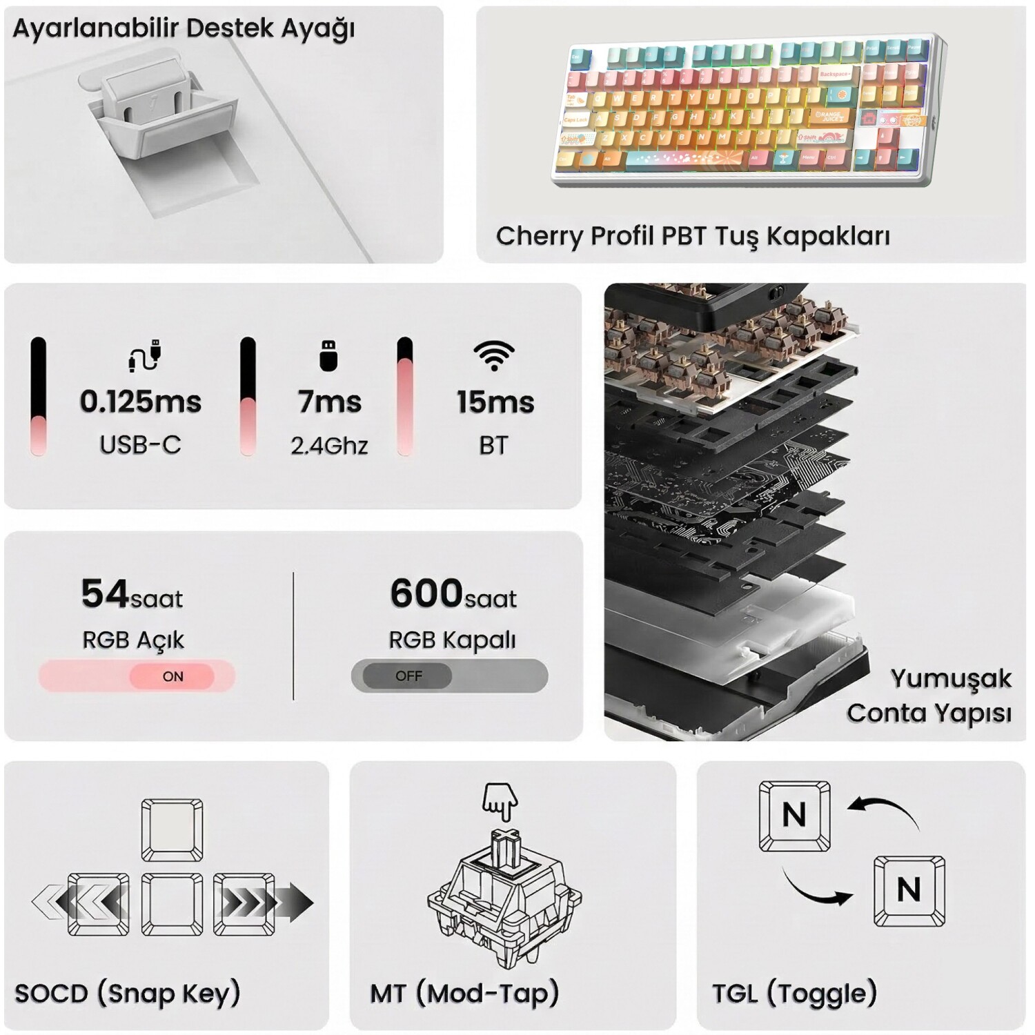 Hot-Swap PCB tasarımı sayesinde klavyede bulunan mekanik switchler lehim gerektirmeden kolayca değiştirilebilir. Bu özellik, kullanıcıların farklı switch türlerini deneyerek kendilerine en uygun yazım hissini oluşturmasına imkan tanır. Plate-Mount stabilizatörler özellikle büyük tuşlarda daha dengeli ve stabil bir kullanım sağlar. South-Facing LED tasarımı ise RGB aydınlatmanın tuş kapaklarıyla daha uyumlu şekilde yayılmasını sağlayarak görsel deneyimi iyileştirir.