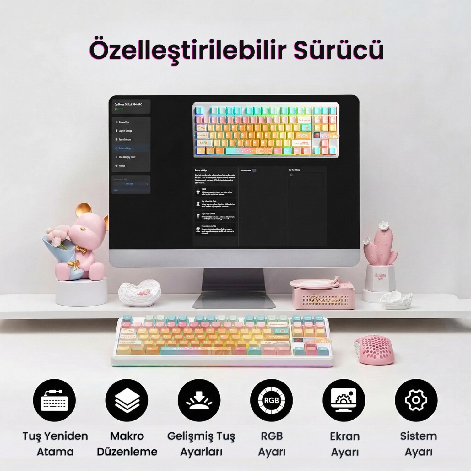 AULA F87 PRO V2'nin özelleştirilebilir sürücüsü ile her tuş vuruşuna hükmedin. Yazılım üzerinden RGB aydınlatma ayarları, makro düzenleme, sistem ayarları ve ekran özelleştirmelerini kolayca yapabilirsiniz. Ayrıca oyunlarda büyük avantaj sağlayan Gelişmiş Tuş fonksiyonlarına sahiptir:
