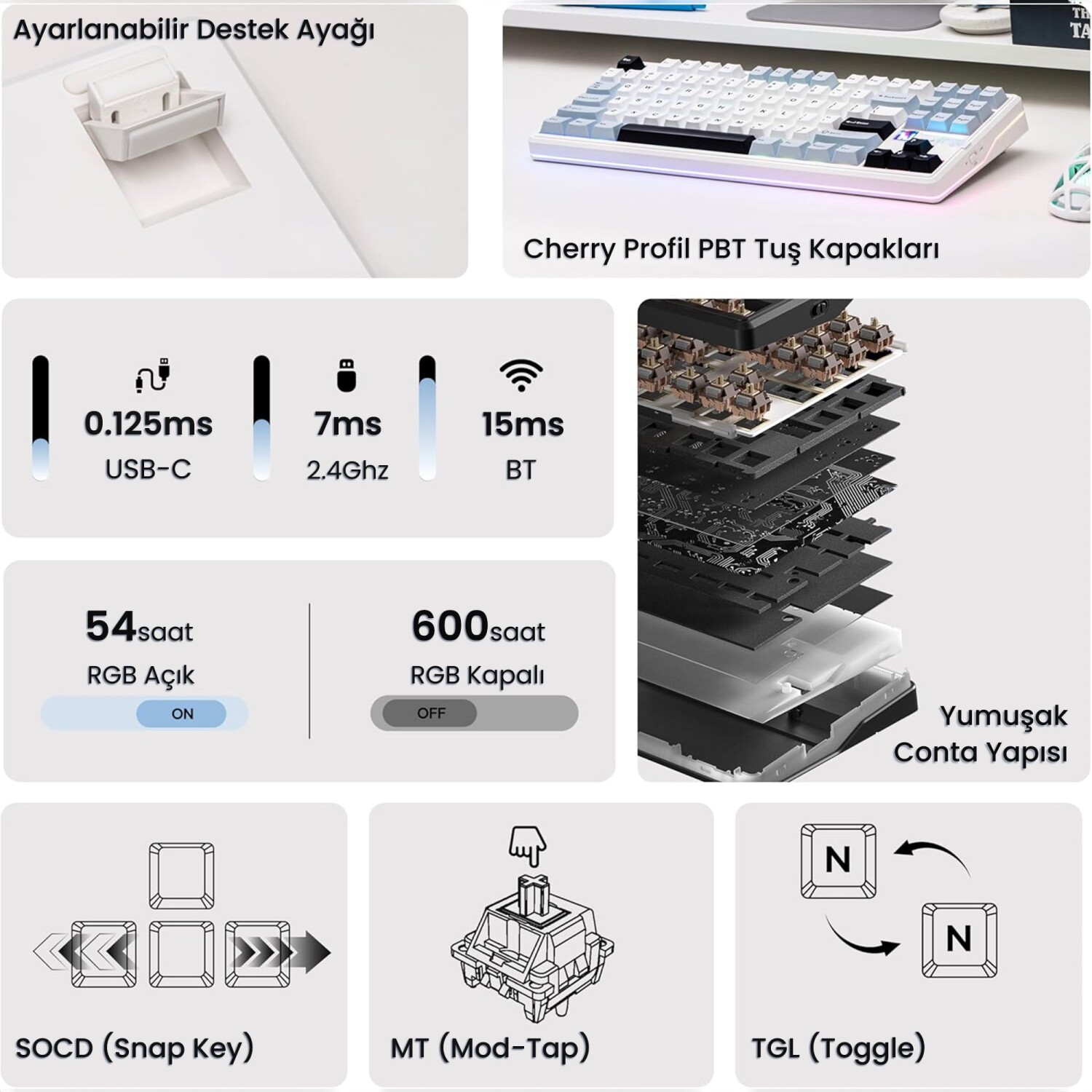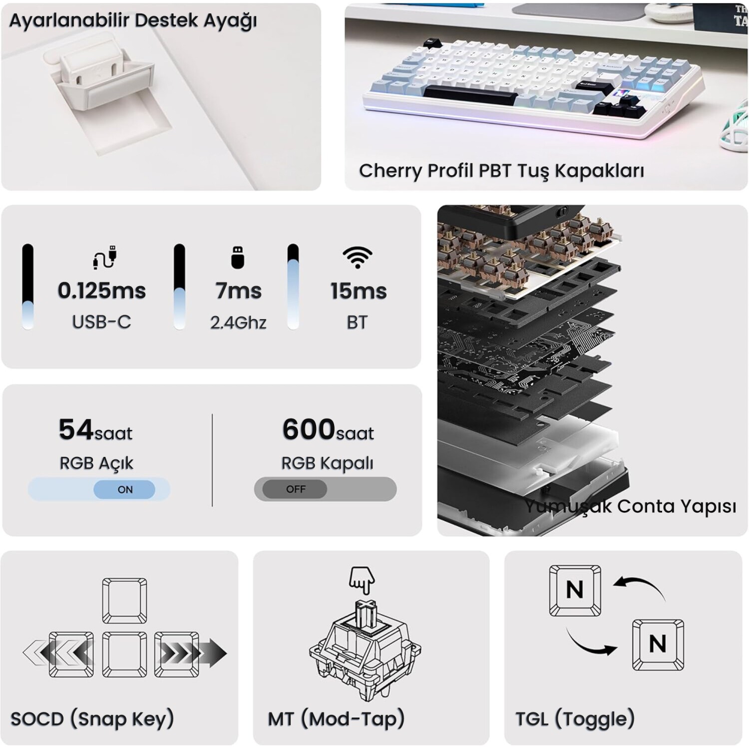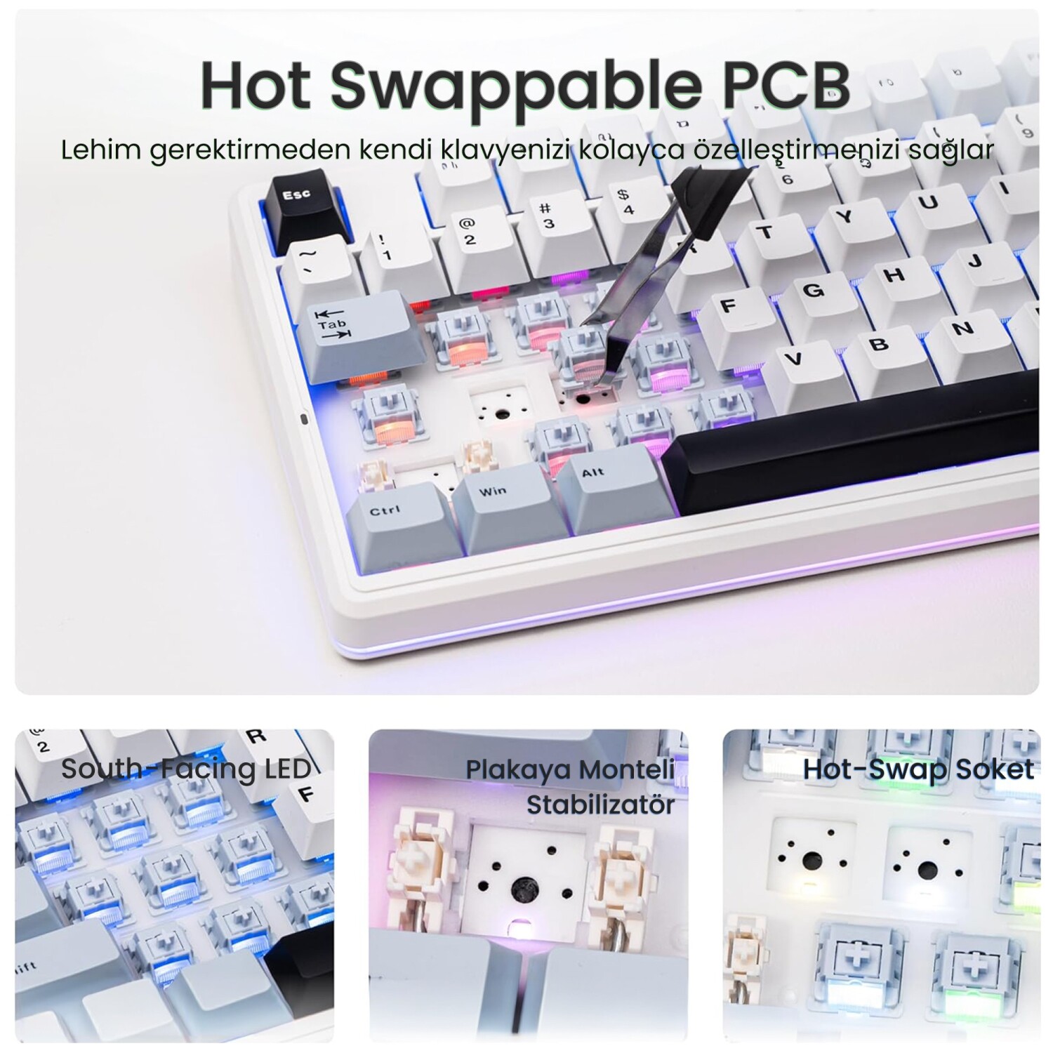 Hot-Swap PCB tasarımı sayesinde klavyede bulunan mekanik switchler lehim gerektirmeden kolayca değiştirilebilir. Bu özellik, kullanıcıların farklı switch türlerini deneyerek kendilerine en uygun yazım hissini oluşturmasına imkan tanır. Plate-Mount stabilizatörler özellikle büyük tuşlarda daha dengeli ve stabil bir kullanım sağlar. South-Facing LED tasarımı ise RGB aydınlatmanın tuş kapaklarıyla daha uyumlu şekilde yayılmasını sağlayarak görsel deneyimi iyileştirir.