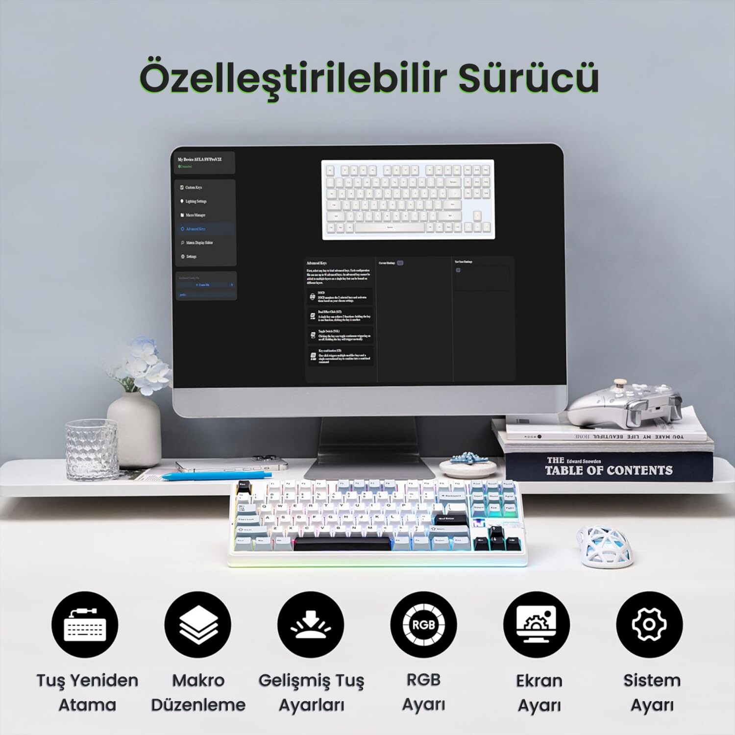 AULA F87 PRO V2'nin özelleştirilebilir sürücüsü ile her tuş vuruşuna hükmedin. Yazılım üzerinden RGB aydınlatma ayarları, makro düzenleme, sistem ayarları ve ekran özelleştirmelerini kolayca yapabilirsiniz. Ayrıca oyunlarda büyük avantaj sağlayan Gelişmiş Tuş fonksiyonlarına sahiptir: