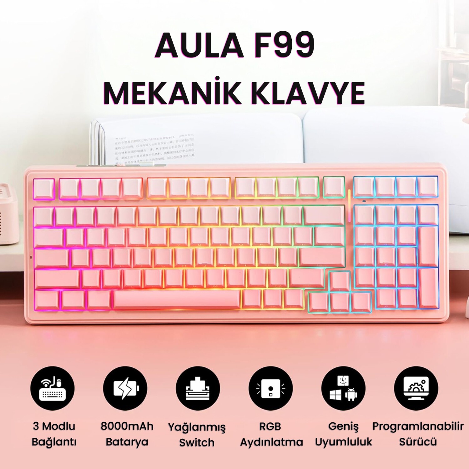 Aula F99 3 Modlu RGB Hot Swap Mekanik Dream Sakura Switch Kablosuz Makrolu Klavye, oyun ve çalışma performansınızı zirveye taşımak için özel olarak tasarlanmış bir klavyedir. Kompakt yapısı, dayanıklılığı ve sunduğu kişiselleştirme olanaklarıyla her seviyede kullanıcıya hitap eder.
