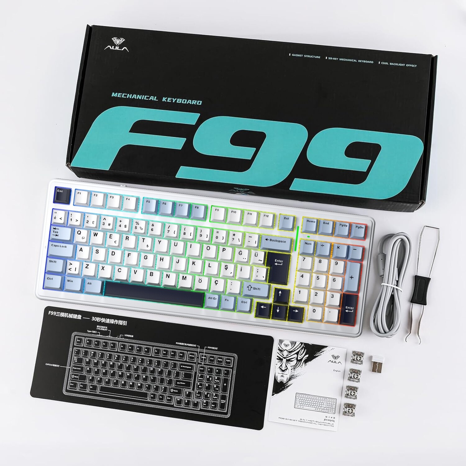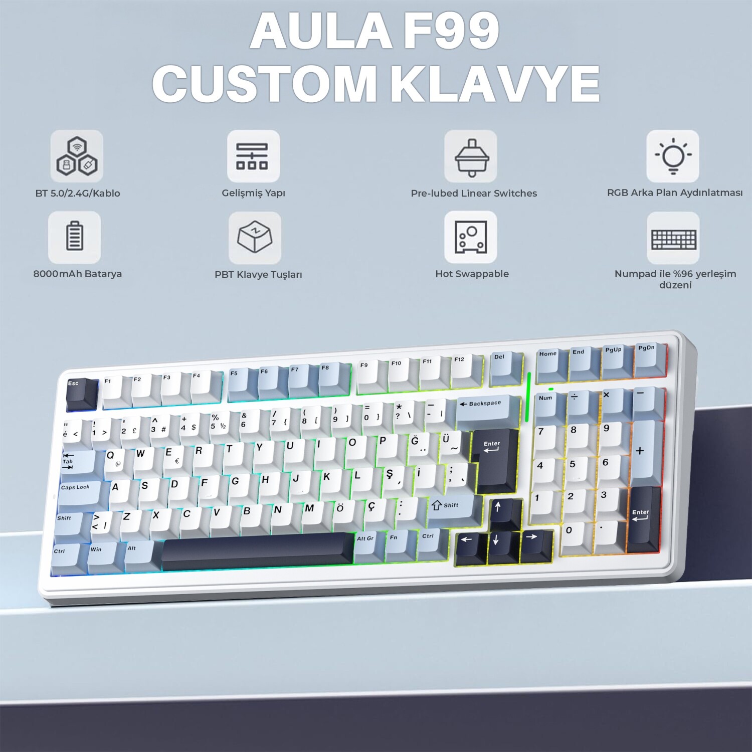 Aula F99, yenilikçi özellikleri ve üstün tasarımıyla hem profesyonel kullanıcıların hem de oyuncuların ihtiyaçlarını karşılayacak bir klavye olarak öne çıkıyor. Kompakt yapısına rağmen numpad içeren tasarımı, yüksek performansı ve dayanıklılığıyla dikkat çeker.