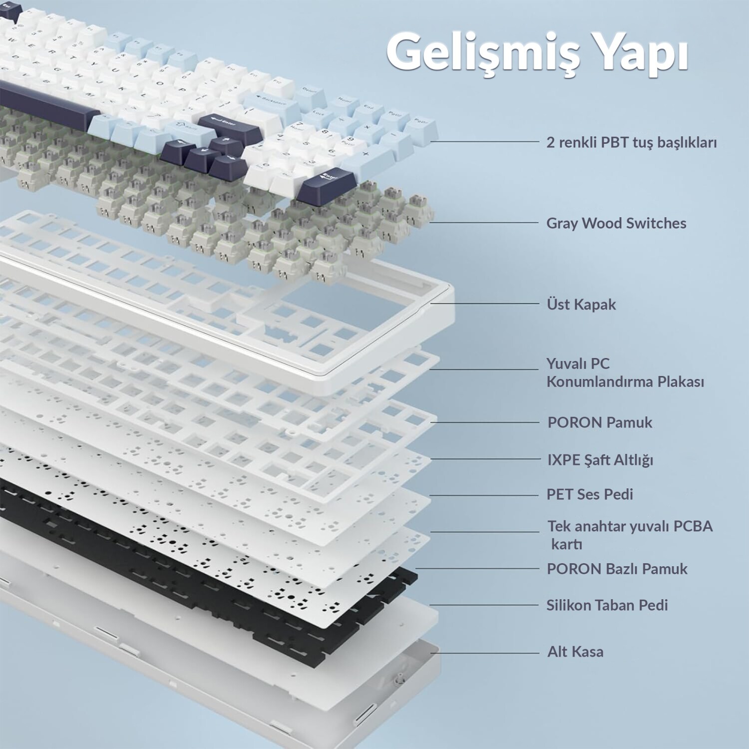 Sessiz bir yazma deneyimi için tasarlanan Reaper Switch’ler, tuşlara yumuşak bir basış hissi sunar. True soft elastik conta yapısı, PORON susturucu pamuk ve beş katmanlı dolgu susturucu ile tamamlanan iç yapı, ses yalıtımı ve yazma konforunu en üst düzeye çıkarır. 1.2 mm PCB slotlama ve ixpe şaft alt pedi sayesinde klavye, her yazma anında daha sessiz ve daha hassas bir performans sergiler. Anti-ghosting özelliği ile tuşlara aynı anda bassanız bile tüm işlemlerini algılayarak bilgisayarınıza aktarır.