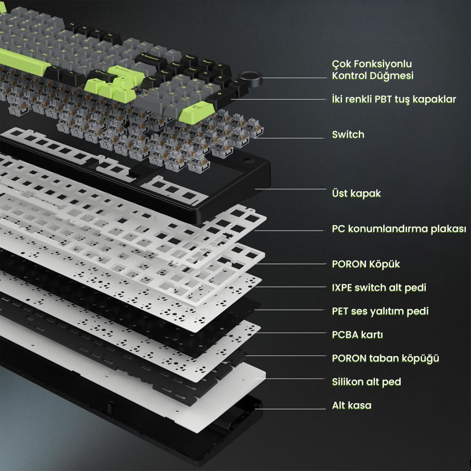 Ses Yalıtımı: 5 Katmanlı Dolgu (Silikon taban, Poron pamuk, IXPE switch pedi vb.)
