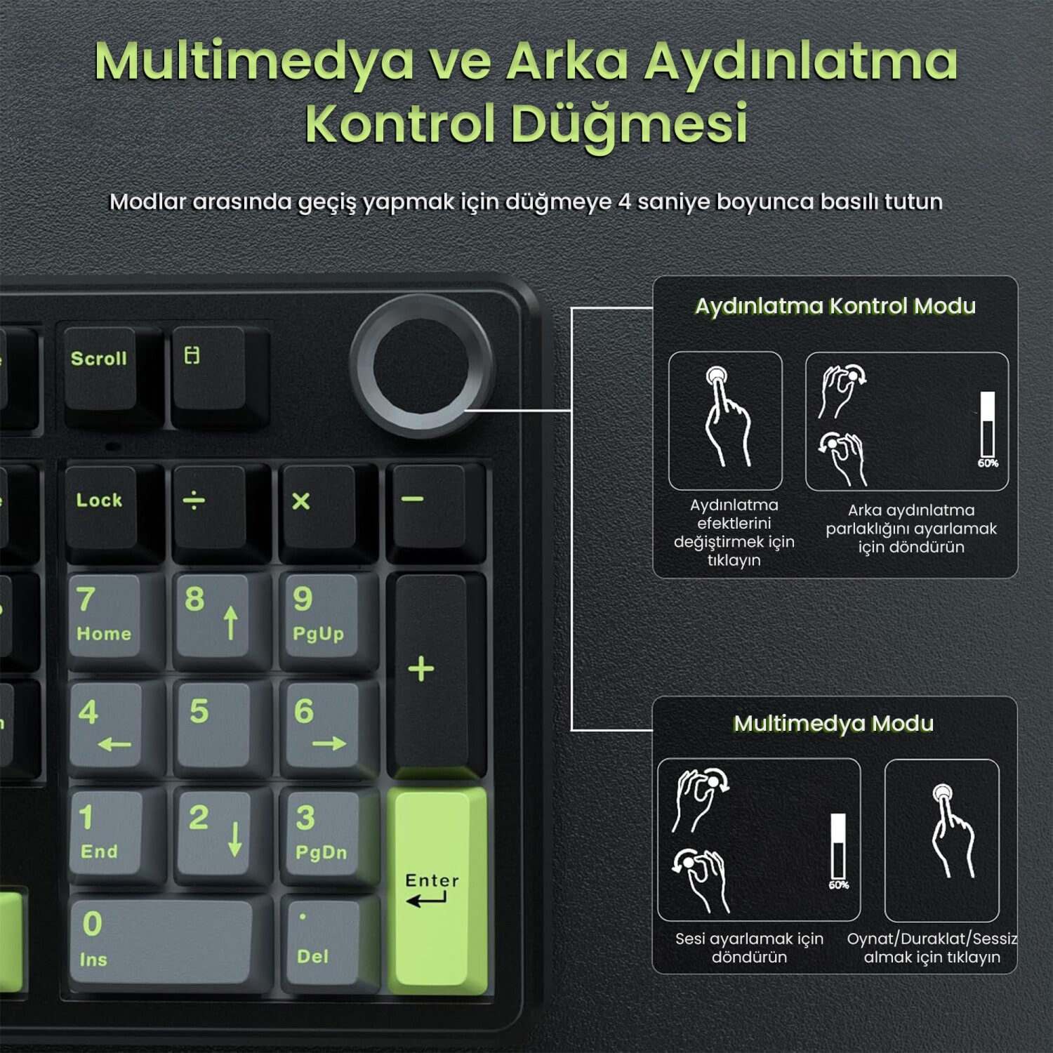 Oyun / Ofis Dual Mode AnahtarıKlavye üzerindeki özel mod tuşu sayesinde tek hareketle oyun veya ofis moduna geçilebilir. Ofis modunda knob sesi yönetmeye odaklı iken oyun modunda RGB efekt kontrolü ön plana çıkar. Mod değişimlerinde CAP ve WIN ışıkları renk değiştirerek mevcut durumu görsel olarak bildirir. Bu sayede kullanıcı, kullanım amacına göre klavyeyi saniyeler içinde özelleştirebilir.