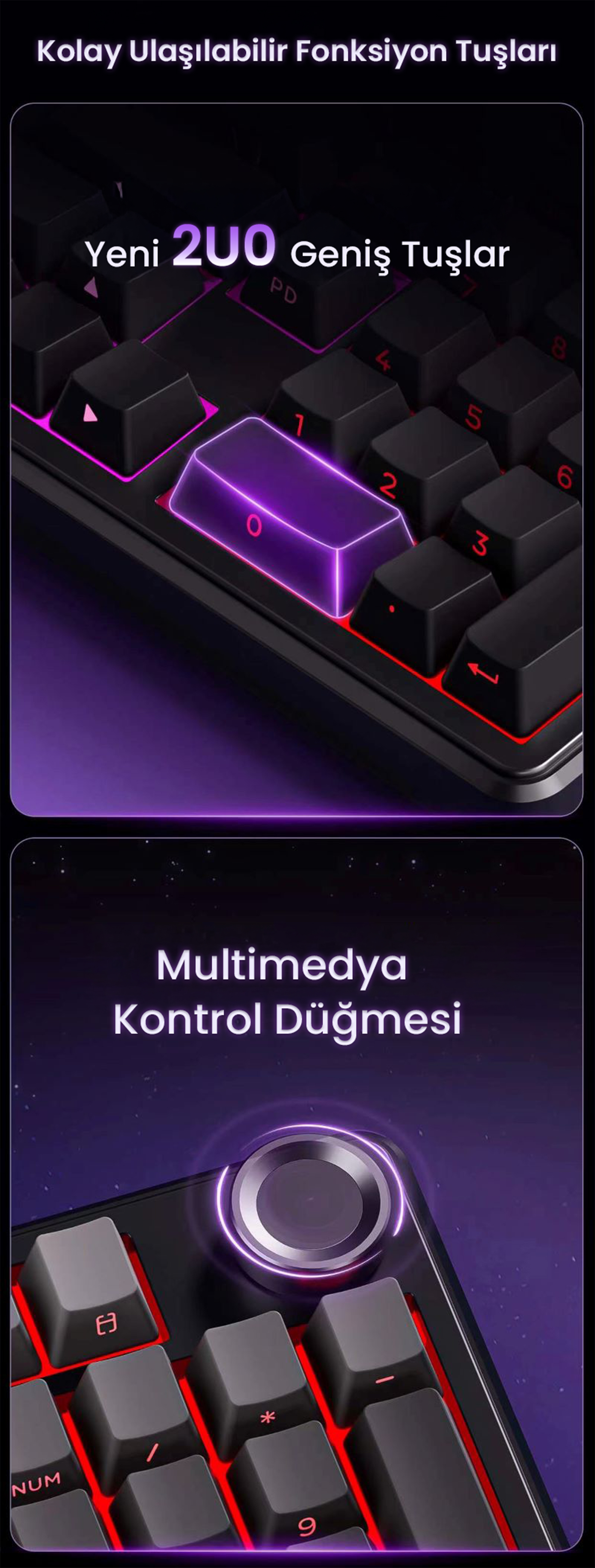 Gelişmiş RGB Aydınlatma ve Atmosfer LED Işık BarıKlavye, hem tuş altı RGB ışıklandırması hem de üst bölümde yer alan RGB atmosfer ışık barı ile geniş kapsamlı özelleştirme seçenekleri sunar. Kullanıcı, Fn kombinasyonları ile renk geçişlerini, ışık efektlerini, parlaklığı ve hız ayarlarını kolaylıkla değiştirebilir. Atmosfer ışık barı farklı modlar ve hız seçenekleri ile masaüstü kullanımına estetik bir görünüm katar.