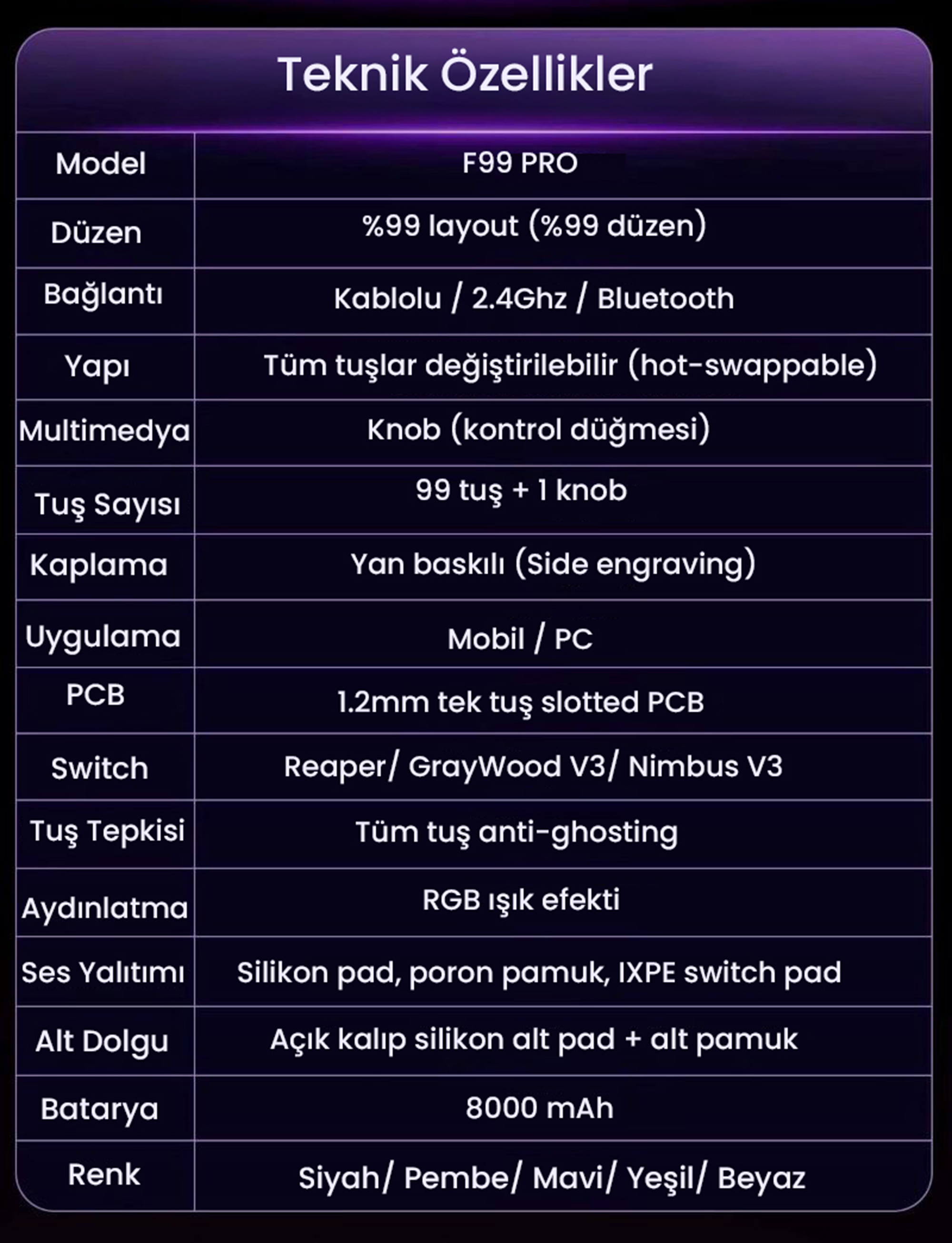 AULA F99 Pro, gasket yapısı sayesinde yumuşak, dengeli ve sessiz bir yazım hissi sunan bir klavye olarak öne çıkar. PCB tek tuş slotlama teknolojisi titreşimleri azaltır ve tuş basımlarını daha kararlı hâle getirir. Gövdesi sağlam malzemelerden üretilmiştir ve uzun kullanım ömrü için tasarlanmıştır. Hot-swap yuvaları, dilediğiniz mekanik switch ve keycap modelleriyle tam kişiselleştirme imkânı sağlar.