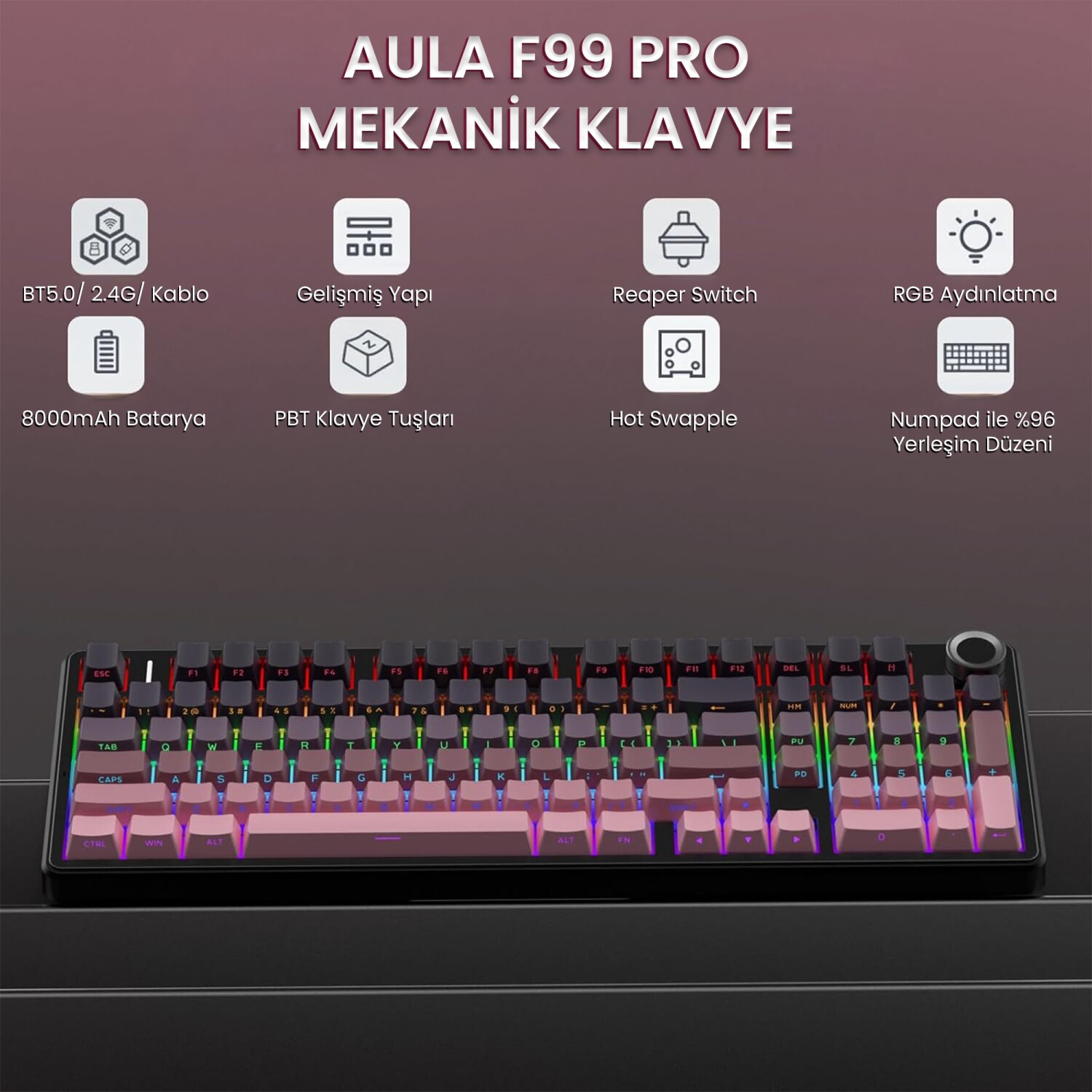 1 x Aula F99 Pro 3 Modlu RGB Hot Swap Mekanik Reaper Switch Kablosuz Makrolu Klavye Gradyan Pembe
