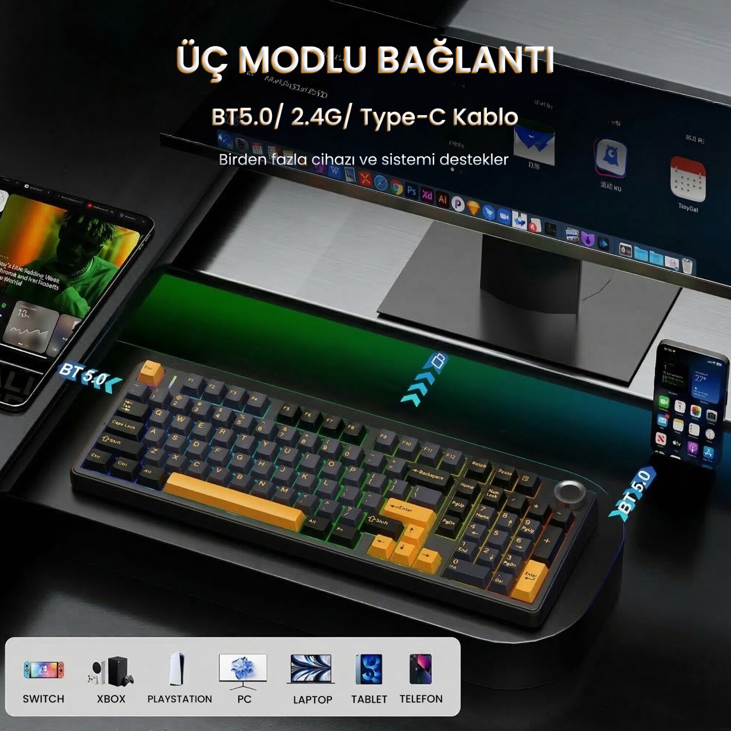 Klavye, tüm cihazlarla uyumlu çok yönlü bir kullanım sunan üç bağlantı modu içerir. Kablolu modda Type-C bağlantısı ile 1000Hz polling rate elde edilerek gecikmesiz bir performans sağlanır. 2.4G kablosuz mod yine 1000Hz hızla yüksek tepki süresi sunarken USB alıcı sayesinde tak-çalıştır kolaylığı sağlar. Bluetooth 3.0 ve 5.0 desteği ile aynı anda üç cihaza bağlanabilir ve Fn+1/2/3 kombinasyonlarıyla bu cihazlar arasında hızlıca geçiş yapılabilir.