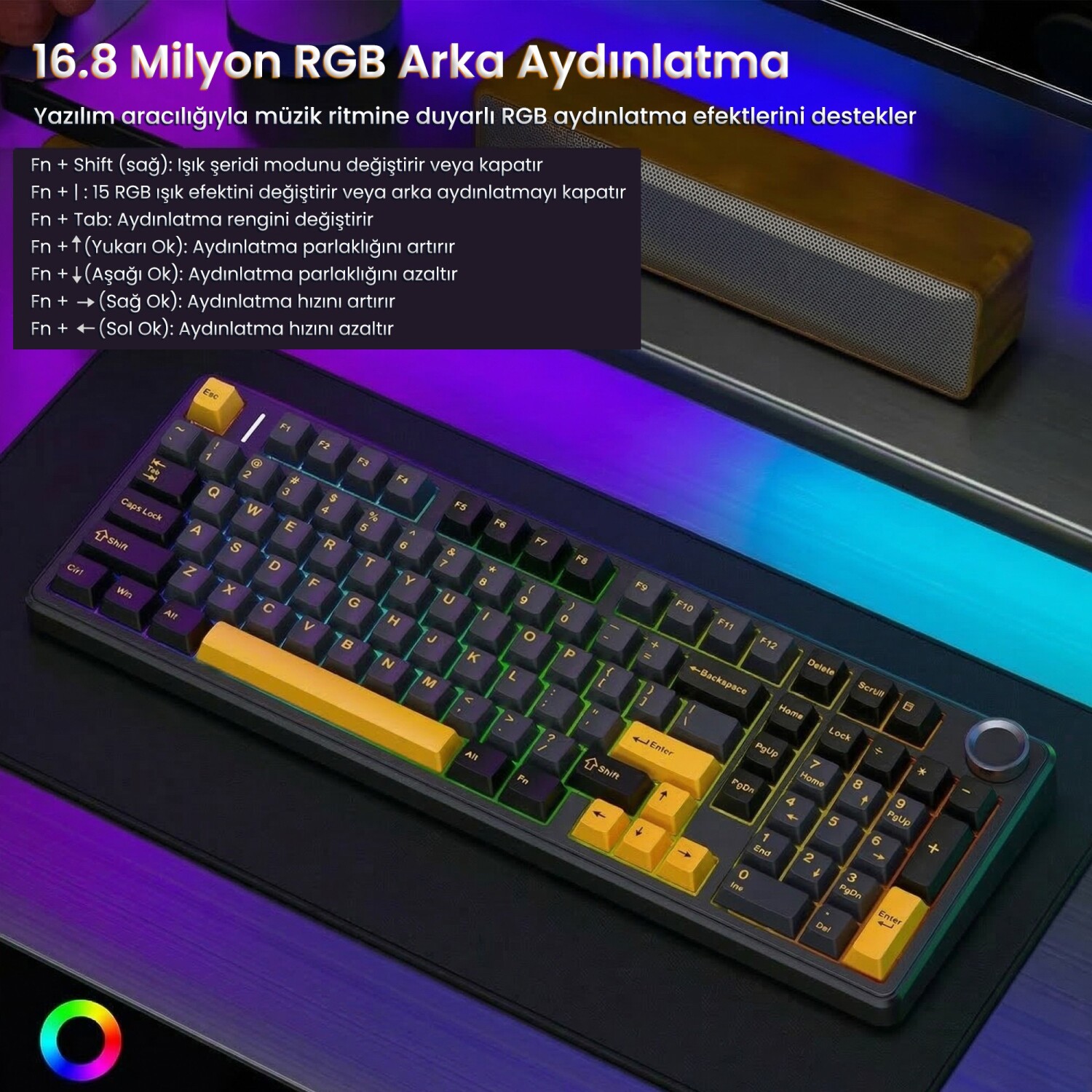 Gelişmiş RGB Aydınlatma ve Atmosfer LED Işık BarıKlavye, hem tuş altı RGB ışıklandırması hem de üst bölümde yer alan RGB atmosfer ışık barı ile geniş kapsamlı özelleştirme seçenekleri sunar. Kullanıcı, Fn kombinasyonları ile renk geçişlerini, ışık efektlerini, parlaklığı ve hız ayarlarını kolaylıkla değiştirebilir. Atmosfer ışık barı farklı modlar ve hız seçenekleri ile masaüstü kullanımına estetik bir görünüm katar.
