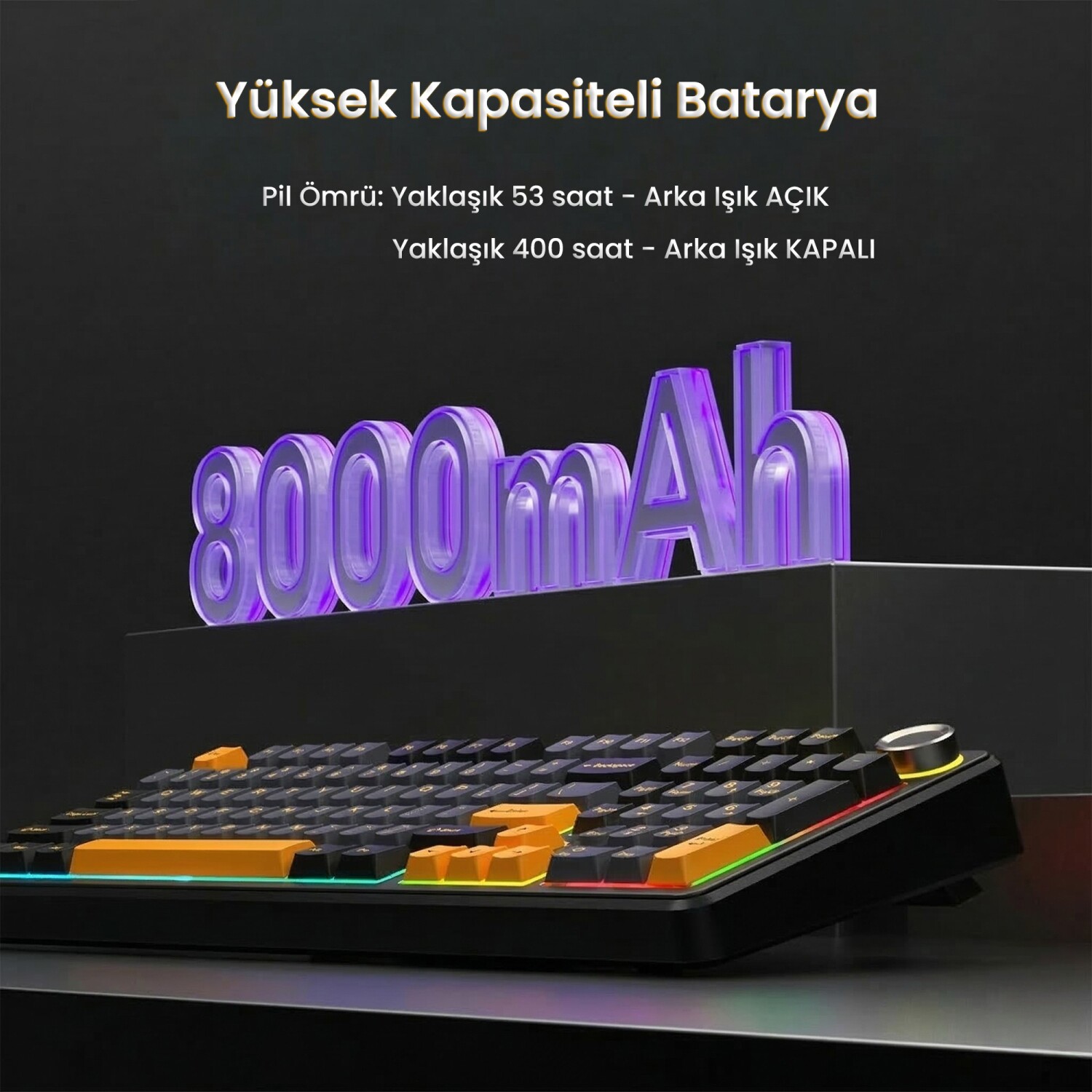 Güçlü Batarya ve Akıllı Uyku Modu8000mAh kapasiteye sahip batarya, RGB açıkken yaklaşık 32 saat, tüm ışıklar kapalıyken yaklaşık 400 saat kullanım süresi sunar. Klavye bir dakika kullanılmadığında otomatik olarak güç tasarruf moduna geçer ve tek tuşla anında uyanır. USB-C üzerinden şarj olurken atmosfer ışık barı akış efektine geçer ve şarj tamamlandığında sabit yeşil yanarak kullanıcıyı bilgilendirir.