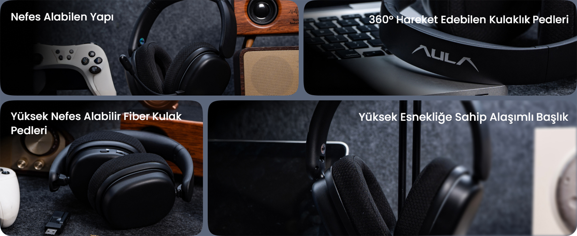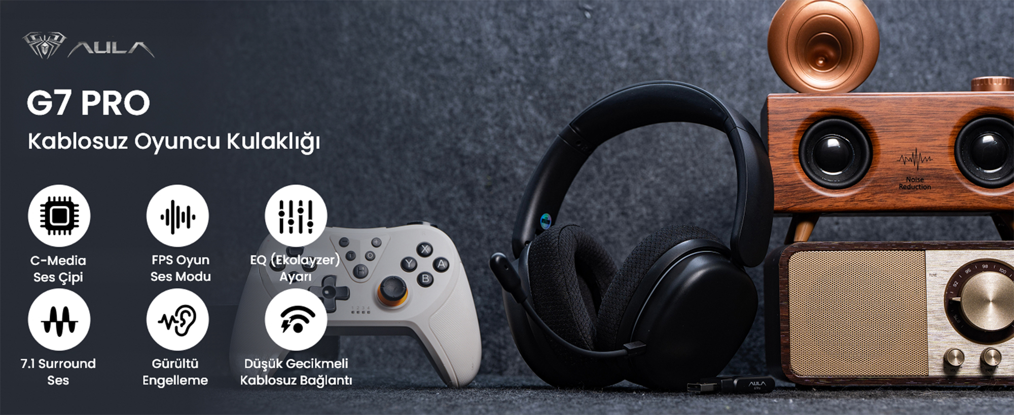 AULA G7 PRO Tri-Mode Oyuncu Kulaklığı, üst düzey donanımıyla oyun deneyiminizi yeniden tanımlıyor. Kutusundan çıktığı anda dikkat çeken profesyonel sınıf e-spor ses kartı çipi ve 40mm dinamik sürücüleri sayesinde en ince ayak seslerinden en şiddetli patlamalara kadar her detayı kusursuz bir netlikle duymanızı sağlar. 2.4G kablosuz, Bluetooth ve Type-C'den 3.5mm'ye kablolu olmak üzere sunduğu "3'ü 1 Arada" bağlantı özgürlüğü ile bilgisayar, konsol ve mobil cihazlar arasında sınırları ortadan kaldırır. Windows sistemlerde aktif edilebilen sanal 7.1 Surround ses teknolojisi, sizi aksiyonun tam merkezine çekerken; 360 derece yapay zeka (AI) destekli gürültü engelleyici mikrofonu, takım arkadaşlarınızla kristal netliğinde iletişim kurmanızı garanti eder. Sadece 280 gramlık ergonomik yapısı, dinamik RGB aydınlatması ve tek şarjla 80 saate kadar (Bluetooth modunda) dayanan 1000mAh devasa bataryası ile uzun oyun maratonlarının vazgeçilmez ekipmanı olacaktır.