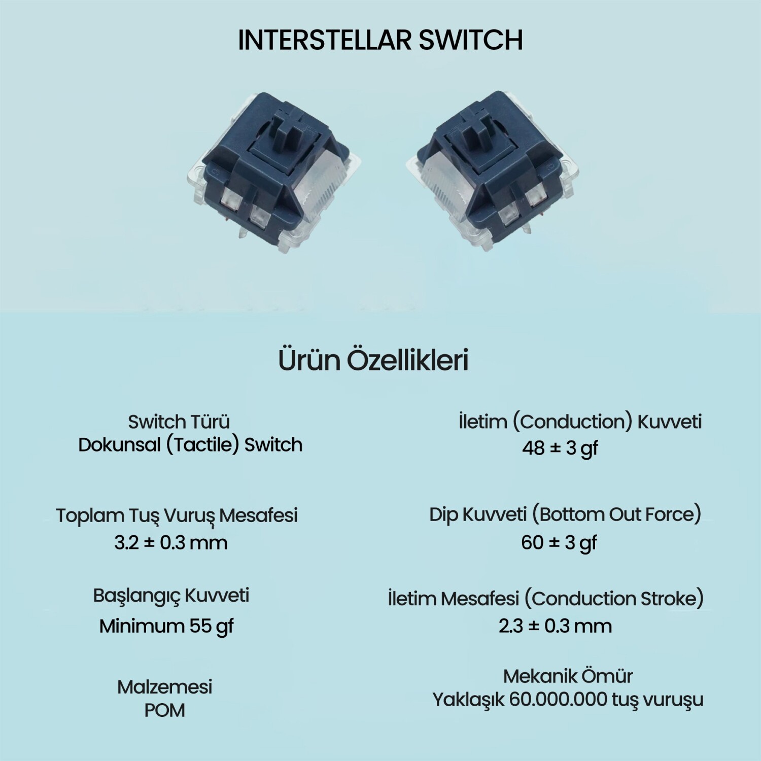 LEOBOG Interstellar, 3.2 ± 0.3 mm toplam tuş mesafesi ve 2.3 ± 0.3 mm iletim noktası (pre-travel) değerleriyle oldukça kısa bir yol kat eder. Bu sayede hızlı tempo isteyen kullanıcılar için ideal bir switch deneyimi sunar.