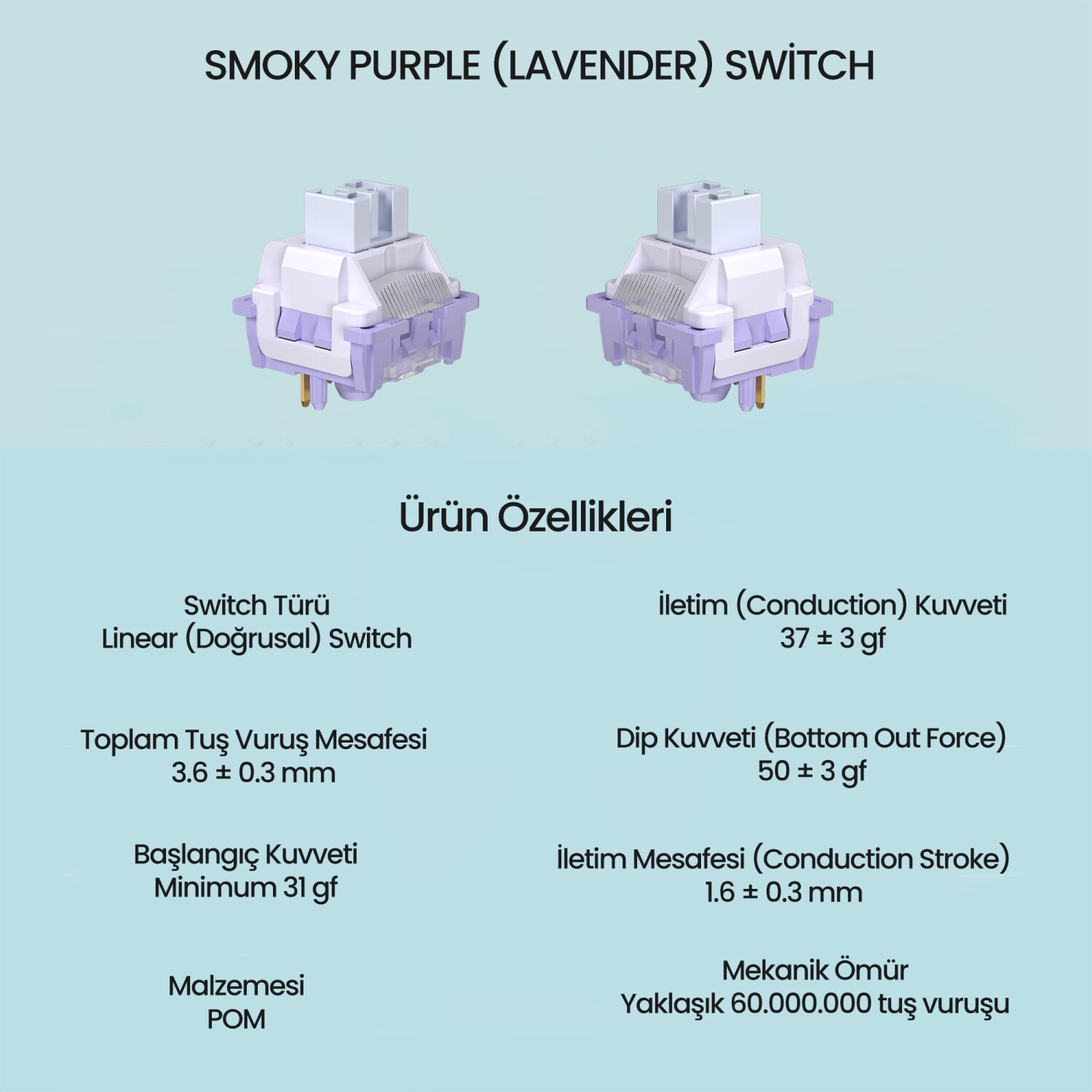 Smoky Purple (Lavender) Switch, yalnızca konfor değil, aynı zamanda yüksek performans da sunar. 3.6 ± 0.3 mm toplam tuş mesafesi ve 1.6 ± 0.3 mm iletim mesafesi, her tuş basımının hassasiyetle algılanmasını sağlar. Yaklaşık 60 milyon tuş vuruşu ömrüyle, uzun süreli kullanımda bile performans kaybı yaşanmaz. Bu teknik değerler, Lavender Switch'in hem dayanıklılığını hem de güvenilirliğini kanıtlar.