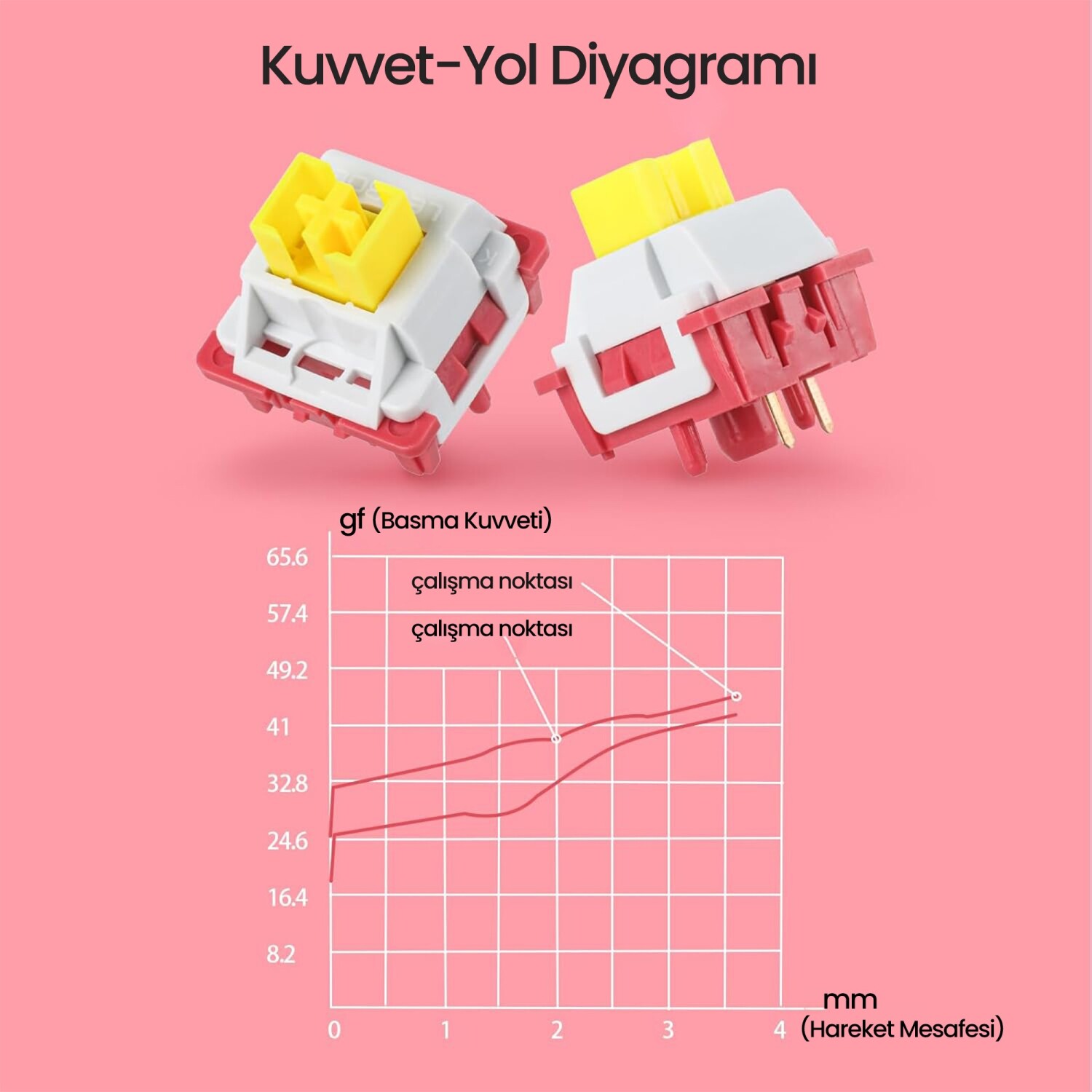 Kırmızı-beyaz renk düzeni ve sarı detaylarıyla dikkat çeken bu switch’ler, klavye kurulumunuza görsel bir dinamizm katar. MX uyumlu yapısıyla çoğu keycap setiyle sorunsuz çalışır, böylece kişisel tarzınıza göre sınırsız özelleştirme imkânı sunar.