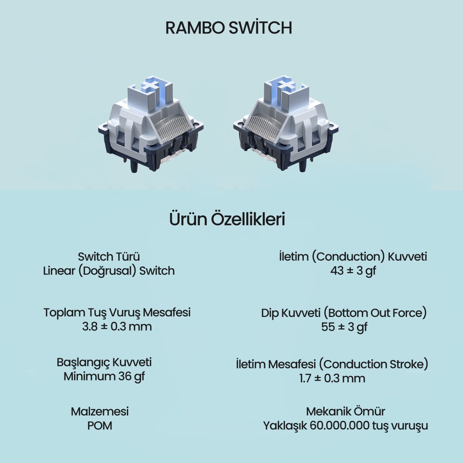 Toplam tuş mesafesi 3.8 ± 0.3 mm, iletim mesafesi 1.7 ± 0.3 mm olarak tasarlanmıştır. Mekanik ömrü yaklaşık 60 milyon tuş vuruşudur. Bu teknik parametreler, LEOBOG Rambo Switch’in uzun ömürlü ve hassas bir kullanım sunduğunu göstermektedir.