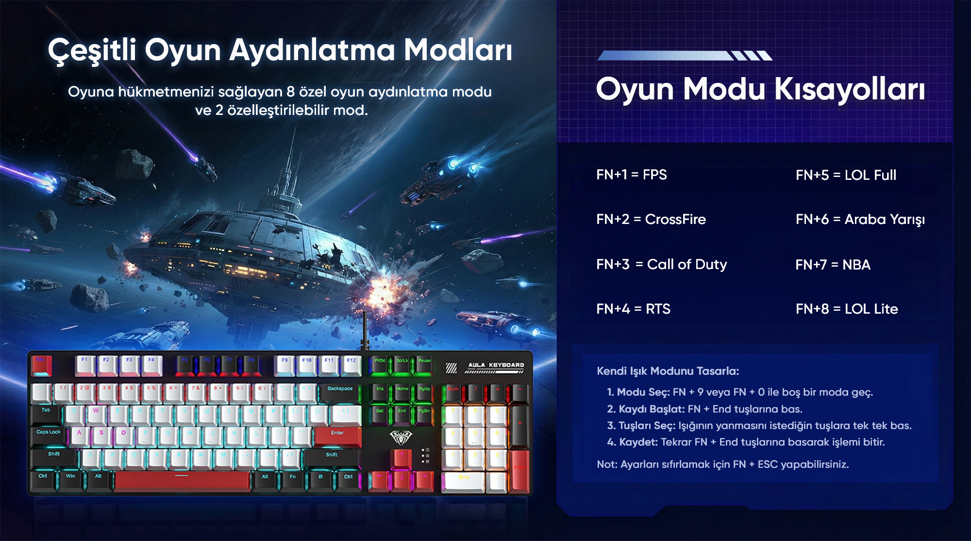 FN+9 veya FN+0 tuş kombinasyonu ile boş bir aydınlatma moduna geçin. Ardından FN+End tuşlarına basarak kaydı başlatın. Işığının yanmasını istediğiniz tuşlara tek tek basın. İşlemi tamamladığınızda tekrar FN+End tuşlarına basarak ayarlarınızı kaydedin. Ayarları sıfırlamak için FN+ESC tuş kombinasyonunu kullanabilirsiniz.