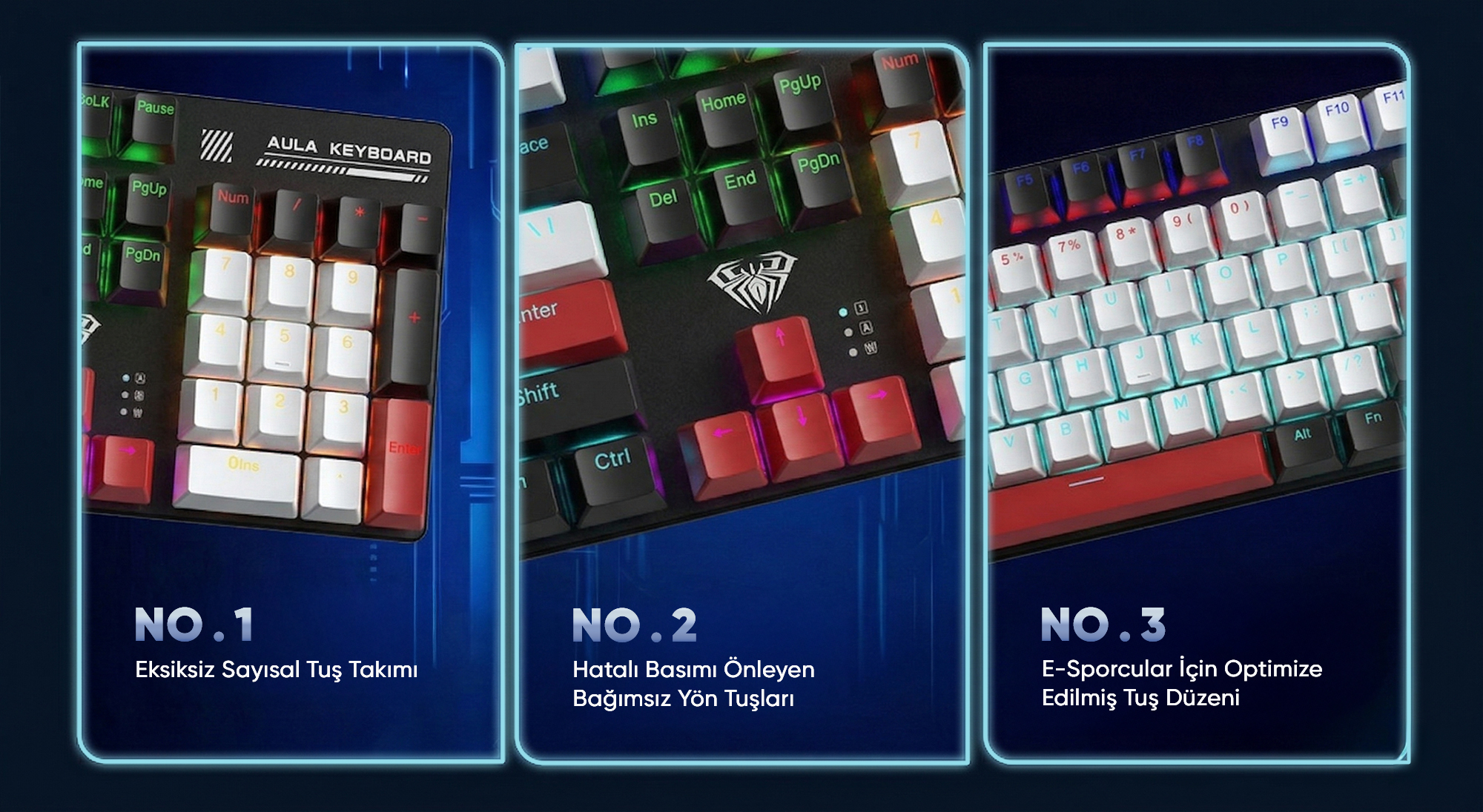 Aula S500, eksiksiz sayısal tuş takımı ile donatılmış 104 tuşa sahiptir. Sayısal tuşların yanı sıra bağımsız yön tuşları sayesinde oyunlarda ani manevralar sırasında yanlış tuşa basma riski ortadan kalkar. E-sporcular için optimize edilmiş tuş düzeni ile FPS, MOBA ve strateji oyunlarında rekabet avantajı sağlar. Tam boy tasarım sayesinde hem oyun hem de ofis kullanımında tüm tuşlara kolay erişim sunar.