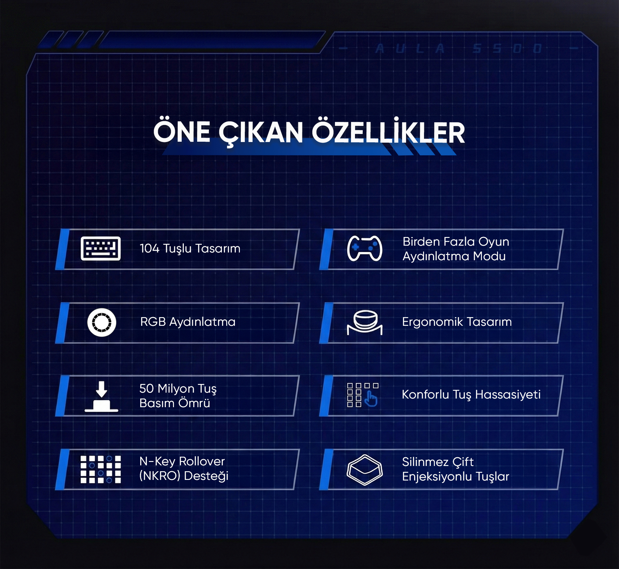 Aula S500, profesyonel oyuncular ve yoğun bilgisayar kullanıcıları için tasarlanmış bir mekanik klavyedir. 50 milyon tuş basım ömrüne sahip dayanıklı switch'ler, fırçalanmış metal panel ve RGB aydınlatma ile hem performans hem de estetik açıdan zirvede yer alır. Çift enjeksiyonlu silinmez tuş kapakları sayesinde uzun yıllar boyunca ilk günkü netliği korurken, N-Key Rollover (NKRO) desteği ile eşzamanlı çoklu tuş basımlarında bile hiçbir komut kaçmaz. 8 özel oyun aydınlatma modu ve 2 özelleştirilebilir ışık profili ile kişiselleştirilmiş oyun deneyimi sunan bu klavye, ergonomik tasarımı sayesinde saatlerce oyun veya ofis çalışmasında el yorgunluğunu minimuma indirir. Dayanıklı metal gövdesi ve uzun ömürlü mekanik switch'leri ile yüksek performanslı klavye arayanlar için ideal seçimdir.