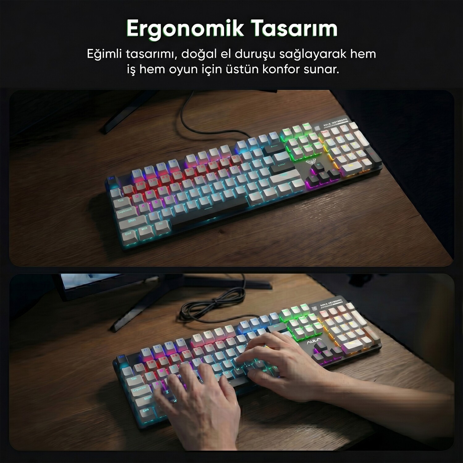 Parmak anatomisine uygun olarak tasarlanmış tuş düzeni, uzun süreli kullanımda bile el ve bilek yorgunluğunu önler. Özellikle WASD bölgesi ve yön tuşları, doğal el pozisyonuna uygun şekilde konumlandırılmıştır. Tuşların yüksekliği ve aralığı, parmaklarınızın rahat hareket etmesini sağlayarak hem oyun hem de yazım performansınızı artırır.