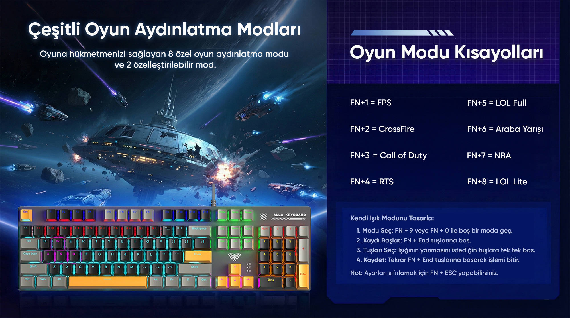 FN+9 veya FN+0 tuş kombinasyonu ile boş bir aydınlatma moduna geçin. Ardından FN+End tuşlarına basarak kaydı başlatın. Işığının yanmasını istediğiniz tuşlara tek tek basın. İşlemi tamamladığınızda tekrar FN+End tuşlarına basarak ayarlarınızı kaydedin. Ayarları sıfırlamak için FN+ESC tuş kombinasyonunu kullanabilirsiniz.