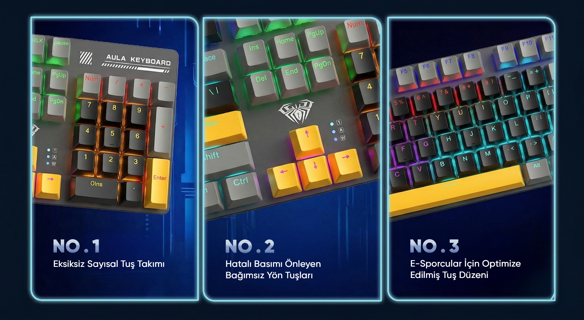 Aula S500, eksiksiz sayısal tuş takımı ile donatılmış 104 tuşa sahiptir. Sayısal tuşların yanı sıra bağımsız yön tuşları sayesinde oyunlarda ani manevralar sırasında yanlış tuşa basma riski ortadan kalkar. E-sporcular için optimize edilmiş tuş düzeni ile FPS, MOBA ve strateji oyunlarında rekabet avantajı sağlar. Tam boy tasarım sayesinde hem oyun hem de ofis kullanımında tüm tuşlara kolay erişim sunar.