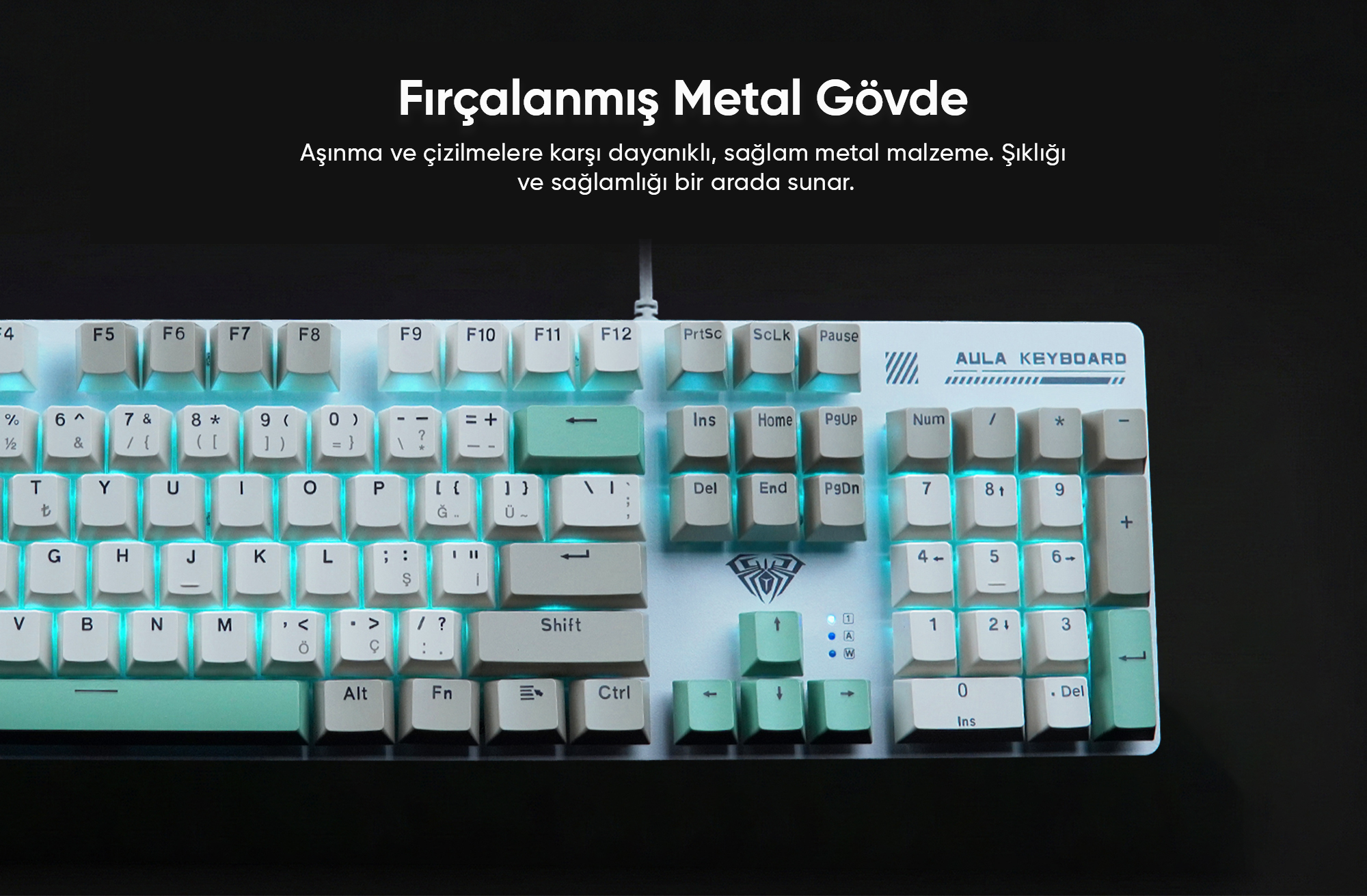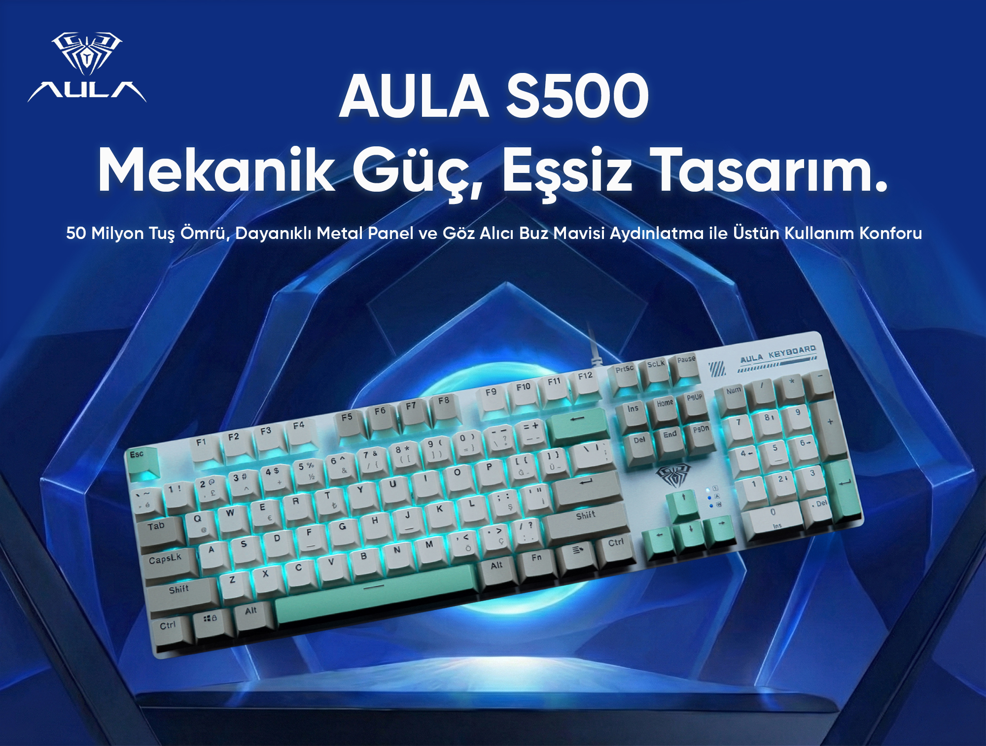 Aula S500, profesyonel oyuncular ve yoğun bilgisayar kullanıcıları için tasarlanmış bir mekanik klavyedir. 50 milyon tuş basım ömrüne sahip dayanıklı switch'ler, fırçalanmış metal panel ve buz mavisi aydınlatma ile hem performans hem de estetik açıdan zirvede yer alır. Çift enjeksiyonlu silinmez tuş kapakları sayesinde uzun yıllar boyunca ilk günkü netliği korurken, N-Key Rollover (NKRO) desteği ile eşzamanlı çoklu tuş basımlarında bile hiçbir komut kaçmaz. 8 özel oyun aydınlatma modu ve 2 özelleştirilebilir ışık profili ile kişiselleştirilmiş oyun deneyimi sunan bu klavye, ergonomik tasarımı sayesinde saatlerce oyun veya ofis çalışmasında el yorgunluğunu minimuma indirir. Dayanıklı metal gövdesi ve uzun ömürlü mekanik switch'leri ile yüksek performanslı klavye arayanlar için ideal seçimdir.