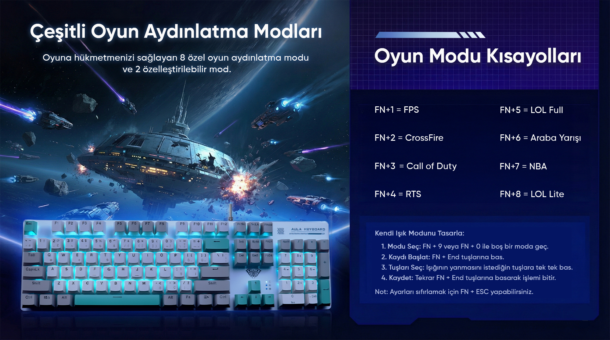 FN+9 veya FN+0 tuş kombinasyonu ile boş bir aydınlatma moduna geçin. Ardından FN+End tuşlarına basarak kaydı başlatın. Işığının yanmasını istediğiniz tuşlara tek tek basın. İşlemi tamamladığınızda tekrar FN+End tuşlarına basarak ayarlarınızı kaydedin. Ayarları sıfırlamak için FN+ESC tuş kombinasyonunu kullanabilirsiniz.