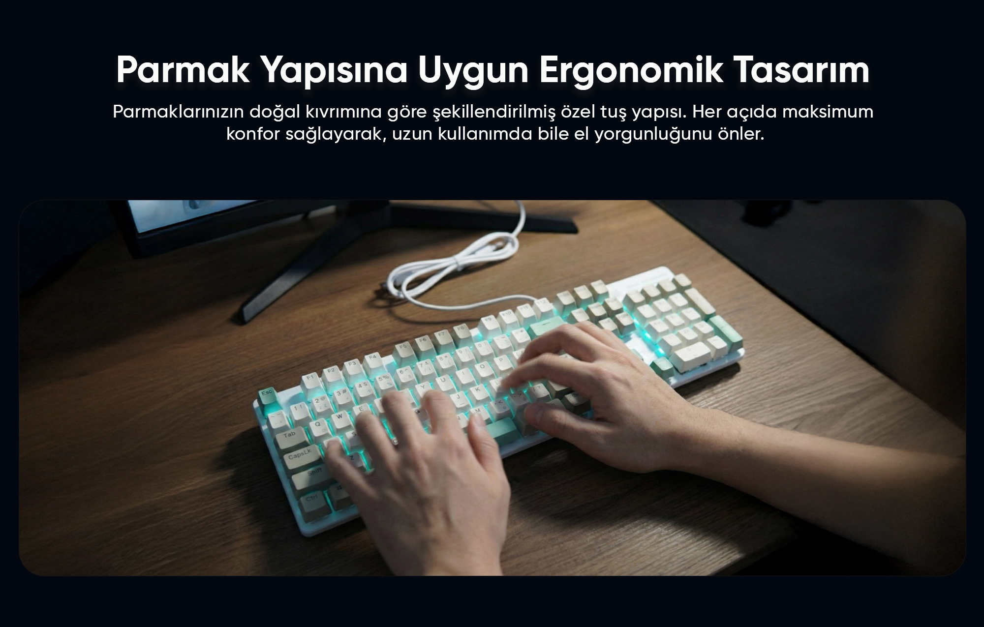 Parmak anatomisine uygun olarak tasarlanmış tuş düzeni, uzun süreli kullanımda bile el ve bilek yorgunluğunu önler. Özellikle WASD bölgesi ve yön tuşları, doğal el pozisyonuna uygun şekilde konumlandırılmıştır. Tuşların yüksekliği ve aralığı, parmaklarınızın rahat hareket etmesini sağlayarak hem oyun hem de yazım performansınızı artırır.