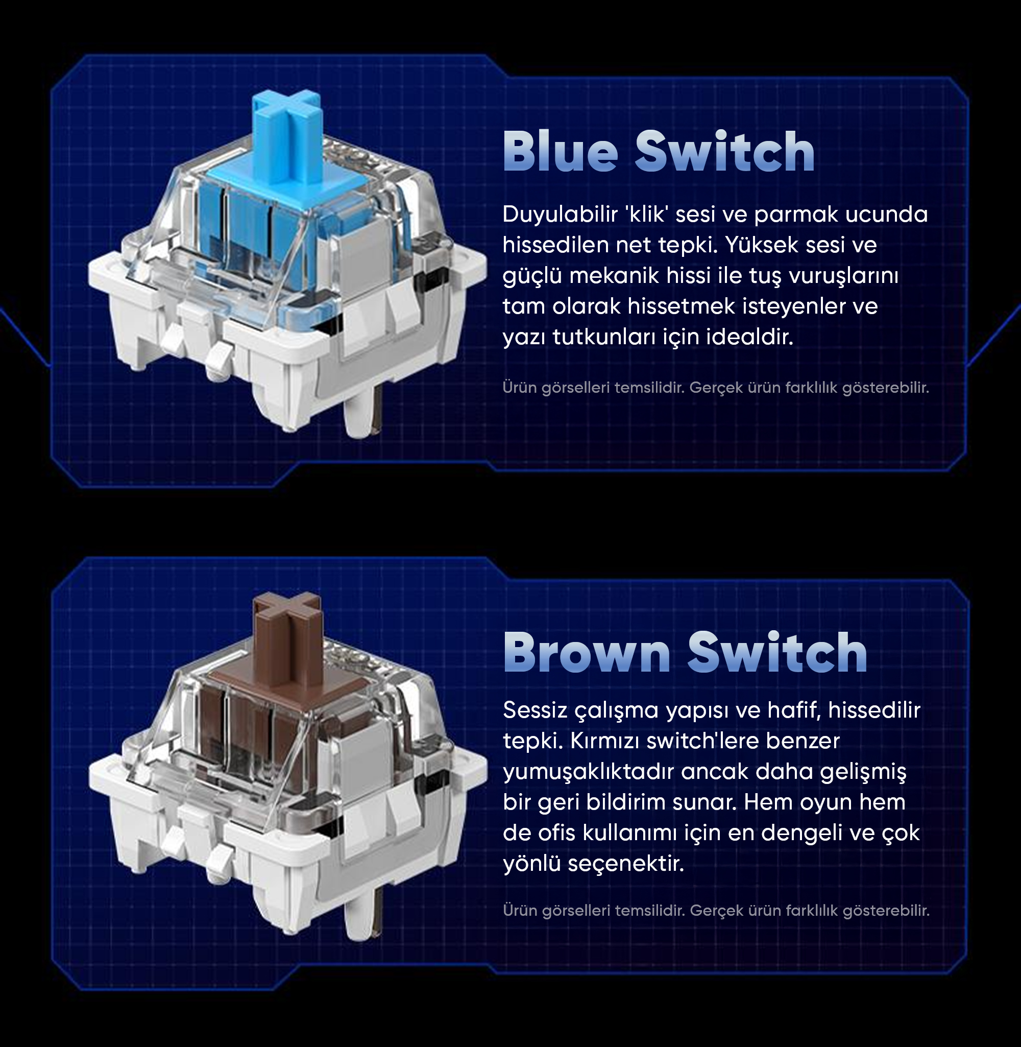 Brown switch, sessiz çalışma yapısı ve hafif, hissedilir tepki ile dengeli bir deneyim sunar. Tuş basımlarında duyulur ses seviyesi düşük olup, ofis ortamlarında veya ortak çalışma alanlarında rahatsızlık yaratmaz. Her tuş basımında hafif bir direnç hissi bulunur, bu da yanlış tuş basımlarını önler. Hem oyun hem de ofis kullanımı için en dengeli ve çok yönlü seçenektir. Uzun süreli yazım veya oyun oturumlarında el yorgunluğunu minimuma indirir.