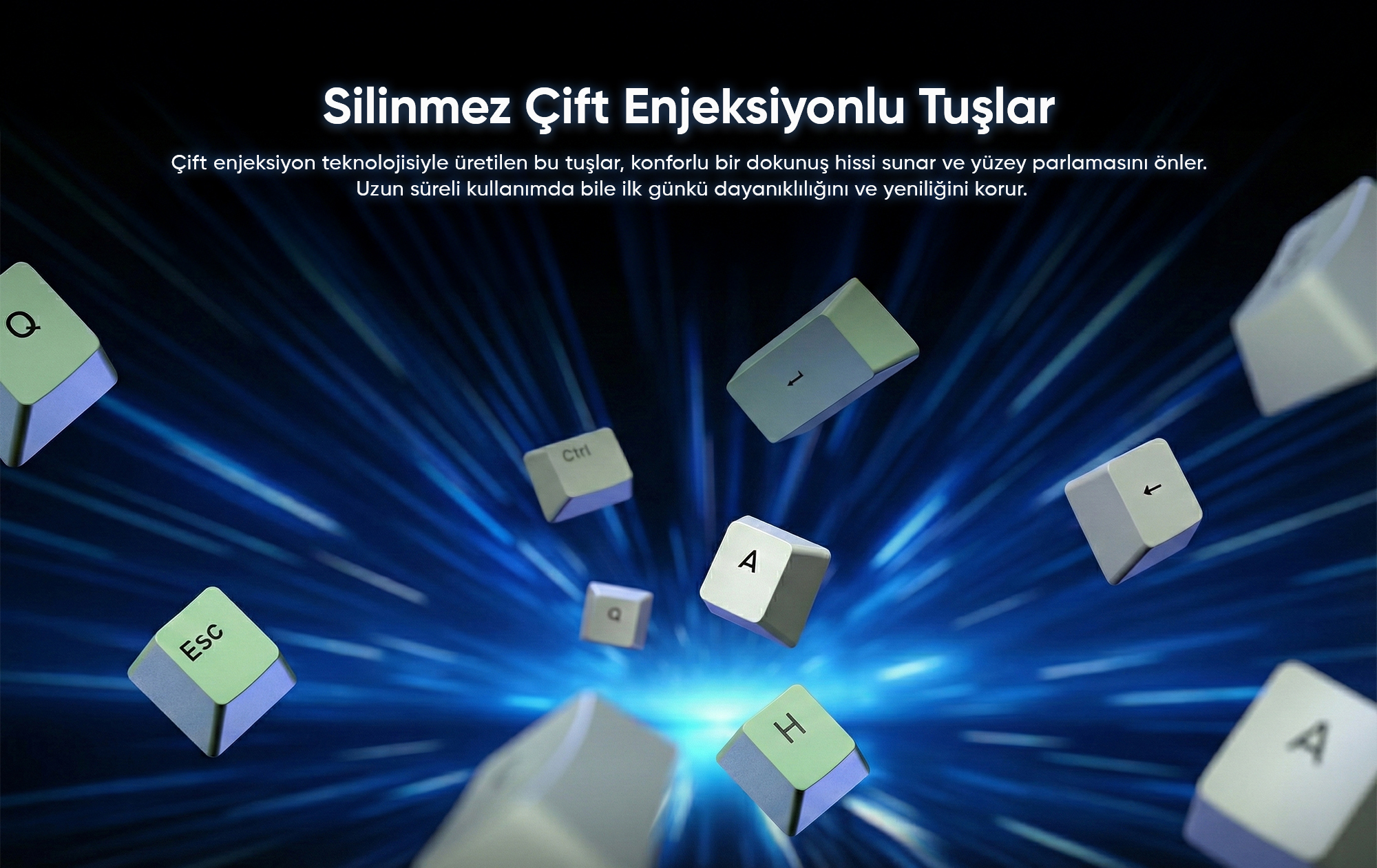 PBT malzemesinden üretilen çift enjeksiyon teknolojisiyle yapılmış tuş kapakları, uzun süreli kullanımda bile karakterlerin silinmesini veya yüzeyin parlamasını engeller. Tuşların üzerindeki yazılar tuşun içine enjekte edildiği için yıpranmaz. Konforlu dokunuş hissi ve kaymaz yüzey yapısı sayesinde parmaklarınız tuşlar üzerinde doğal bir şekilde hareket eder.