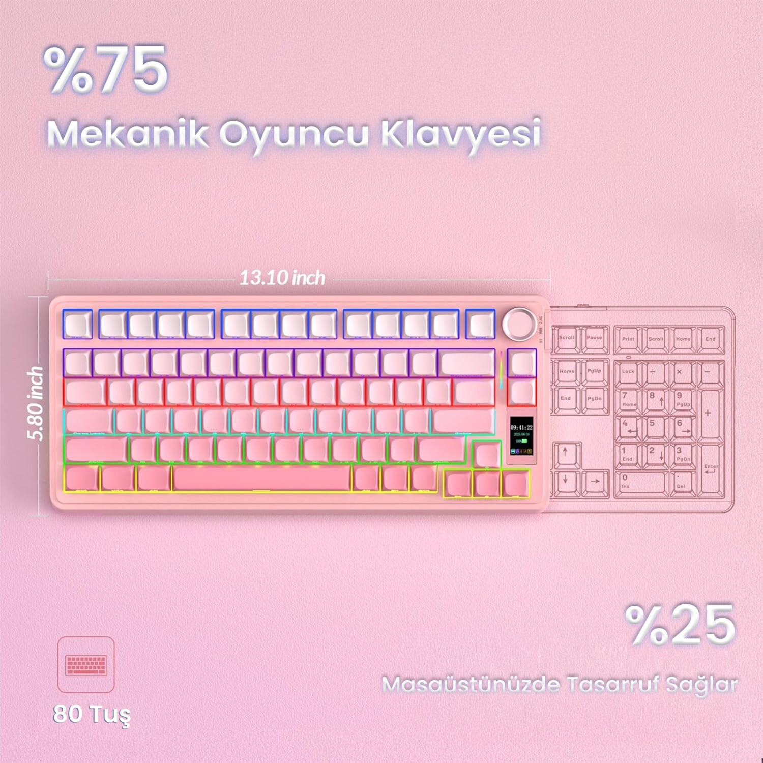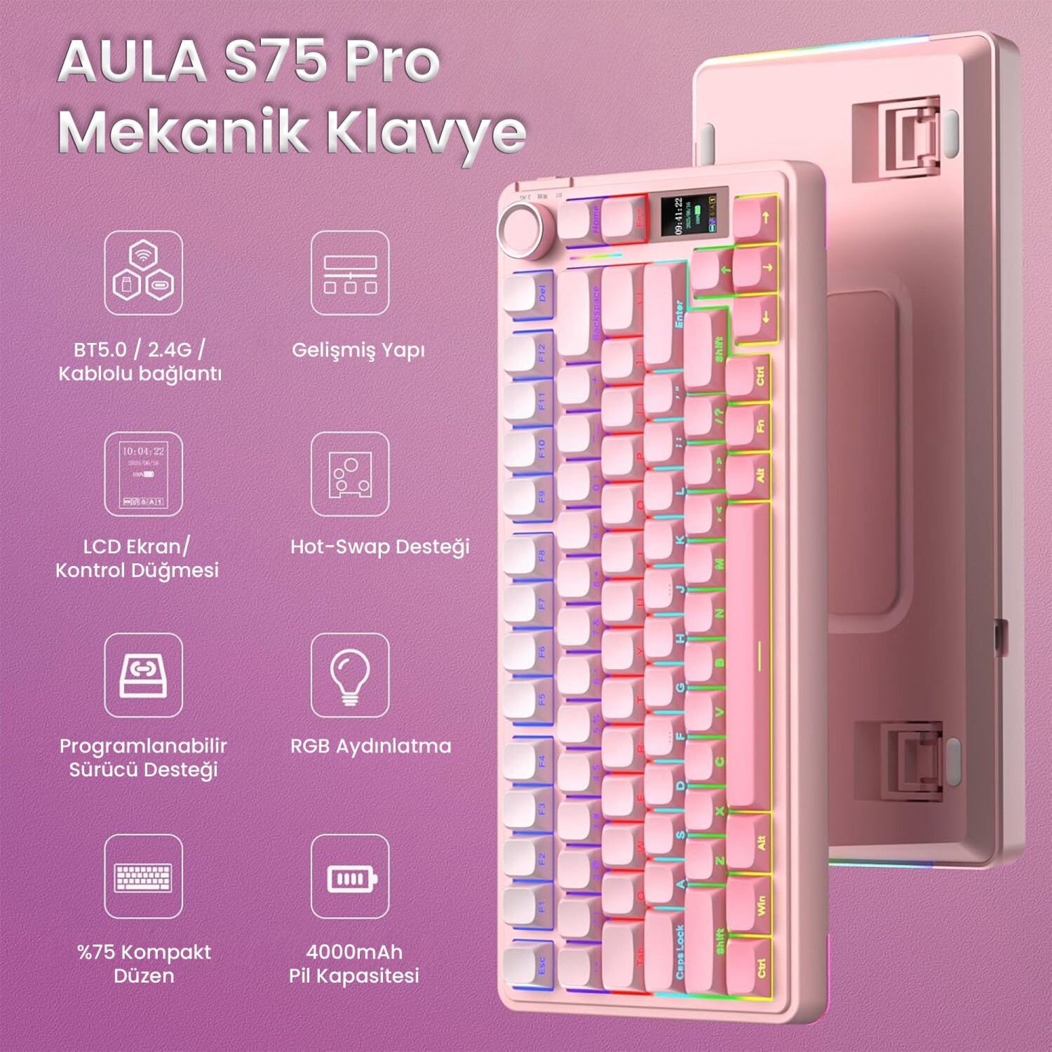TFT Ekran ile Gelişmiş KontrolAULA S75 PRO’nun sağ yanında yer alan 1.14 inç TFT ekran, klavyeye çok yönlü bir kontrol merkezi kazandırır. Ekran üzerinden sistem modu, saat, takvim, aydınlatma ayarları, batarya durumu ve bağlı cihaz bilgileri görüntülenebilir. Klavyenin üst kısmında bulunan çok fonksiyonlu döner kontrol düğmesi, bu menü içerisindeki tüm seçenekleri hızlı ve pratik şekilde yönetmenizi sağlar. Parlaklık, hız, renk, ses seviyesi ve sistem geçişi tamamen bu düğme ile kontrol edilir.