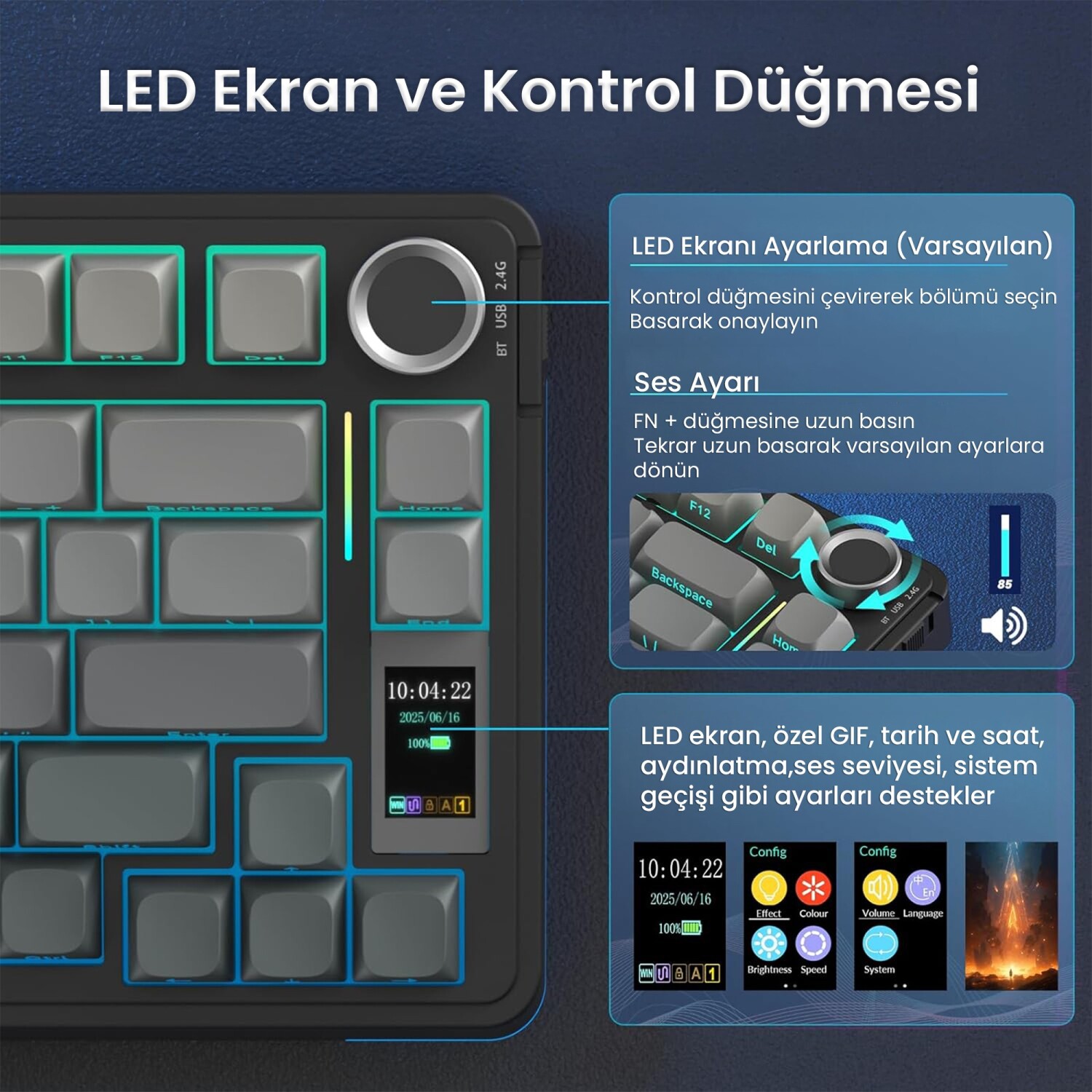 TFT Ekran ile Gelişmiş KontrolAULA S75 PRO’nun sağ yanında yer alan 1.14 inç TFT ekran, klavyeye çok yönlü bir kontrol merkezi kazandırır. Ekran üzerinden sistem modu, saat, takvim, aydınlatma ayarları, batarya durumu ve bağlı cihaz bilgileri görüntülenebilir. Klavyenin üst kısmında bulunan çok fonksiyonlu döner kontrol düğmesi, bu menü içerisindeki tüm seçenekleri hızlı ve pratik şekilde yönetmenizi sağlar. Parlaklık, hız, renk, ses seviyesi ve sistem geçişi tamamen bu düğme ile kontrol edilir.